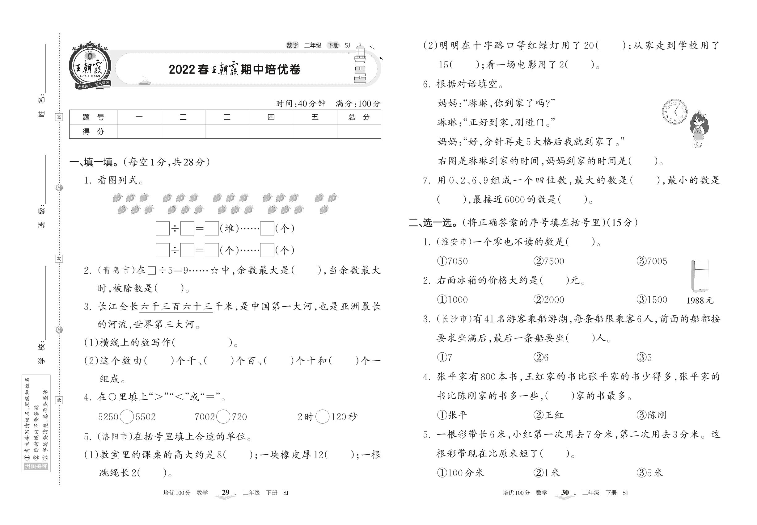 2022下册二年级数学苏教版 王朝霞期中培优卷