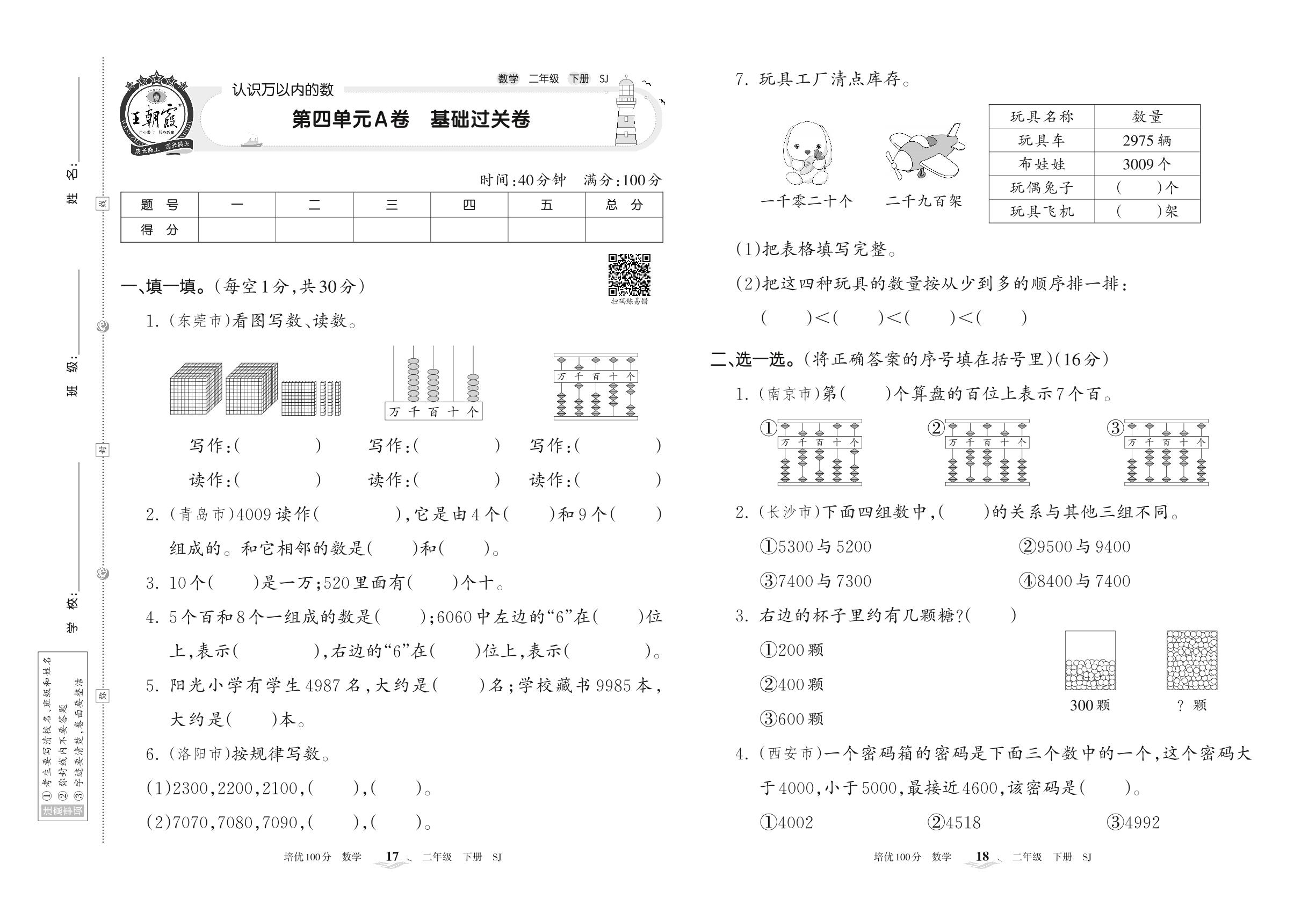 2022下册二年级数学苏教版 第四单元A卷 基础过关卷
