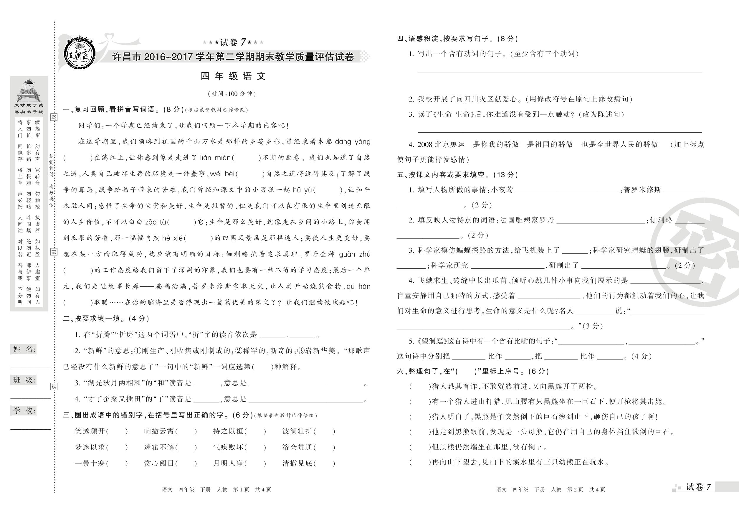 2016-2017学年第二学期许昌市四年级语文试卷(人教版)【7】