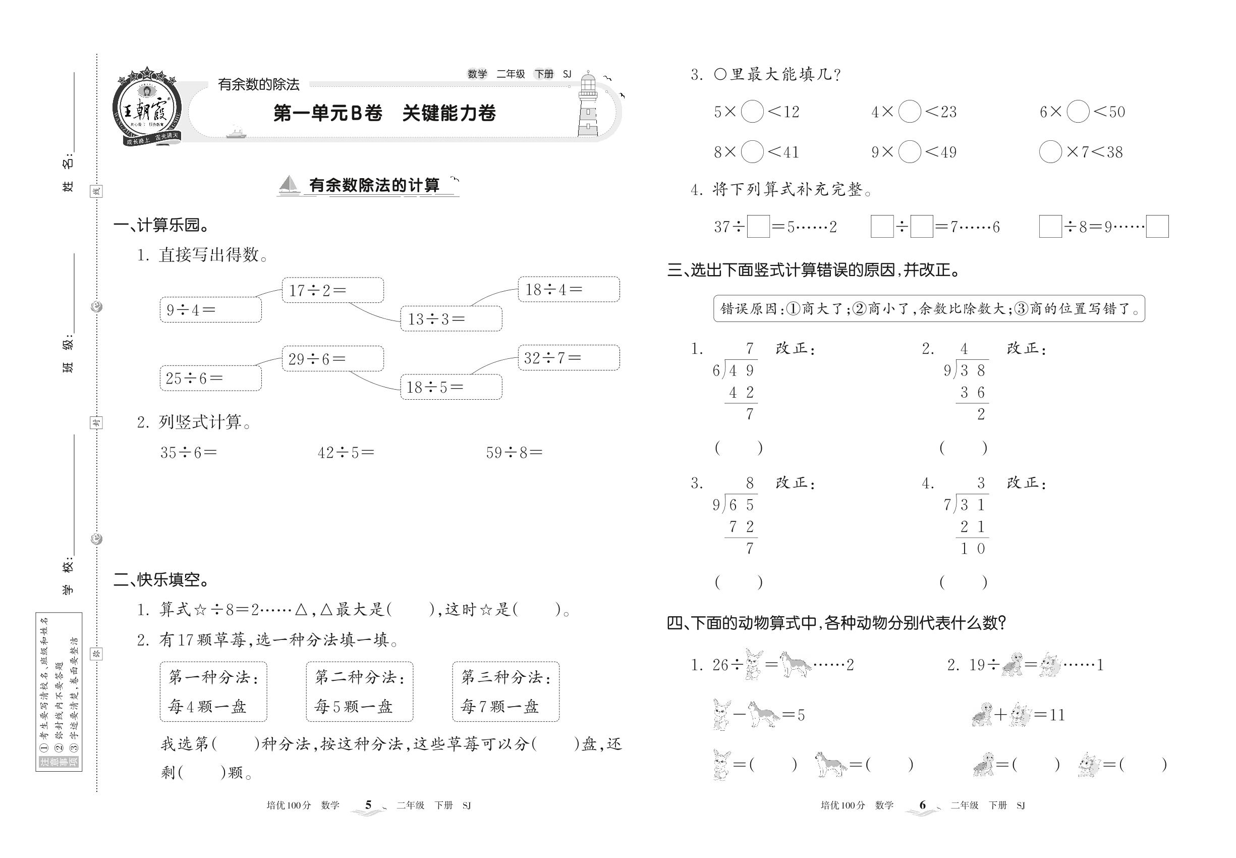 2022下册二年级数学苏教版 第一单元B卷 关键能力卷