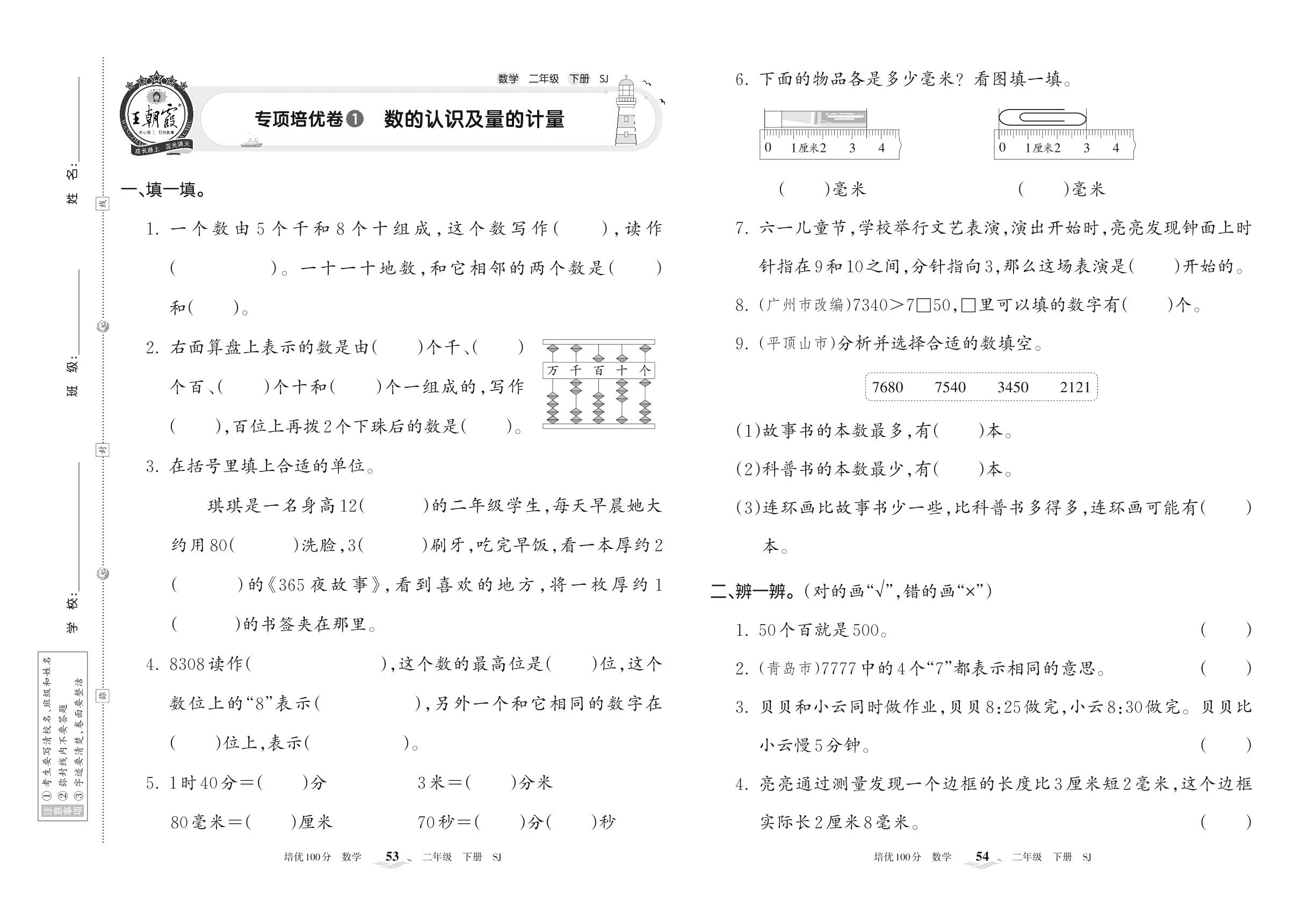 2022下册二年级数学苏教版 专项培优卷1 数的认识及量的计量