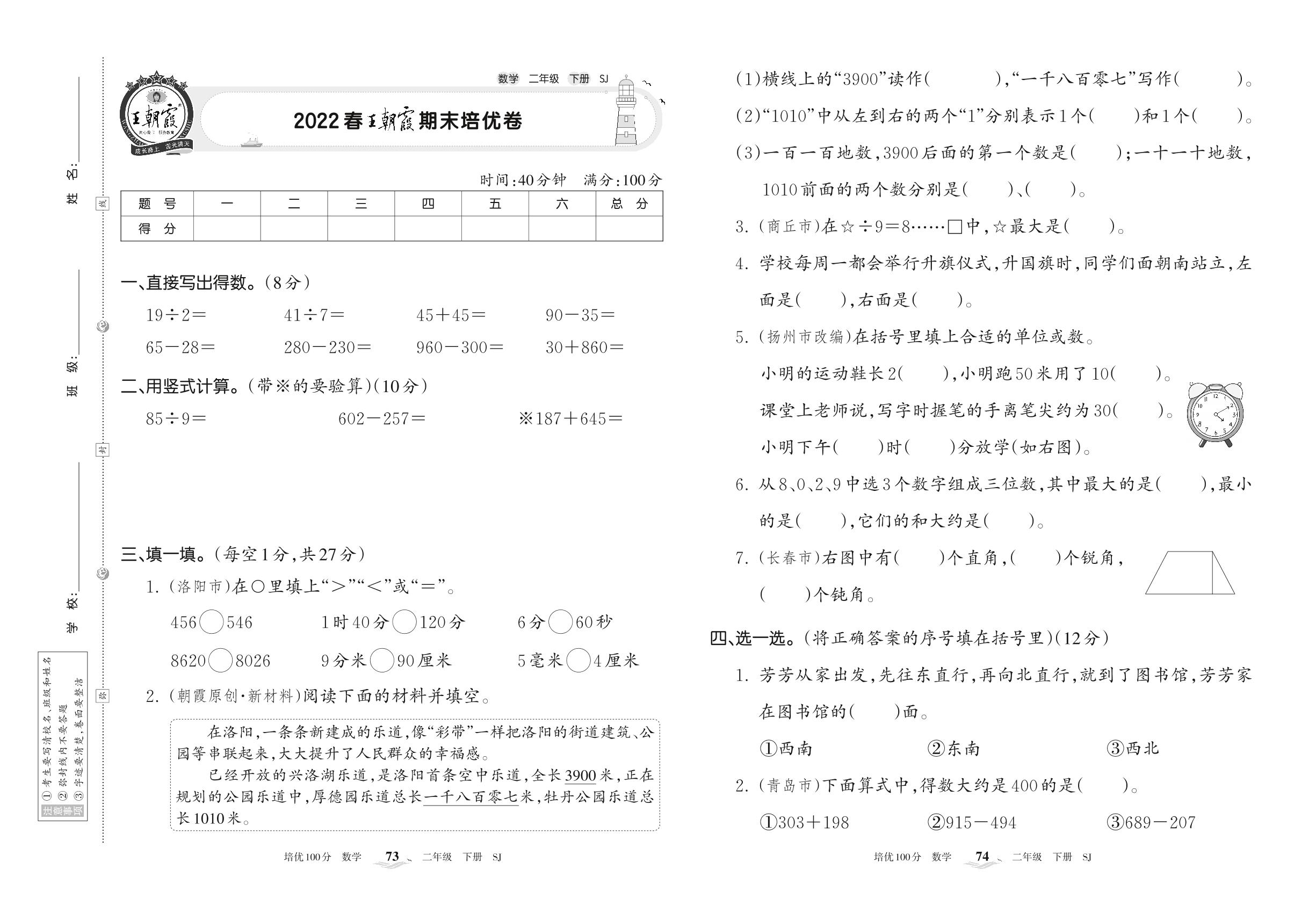 2022下册二年级数学苏教版 王朝霞期末培优卷