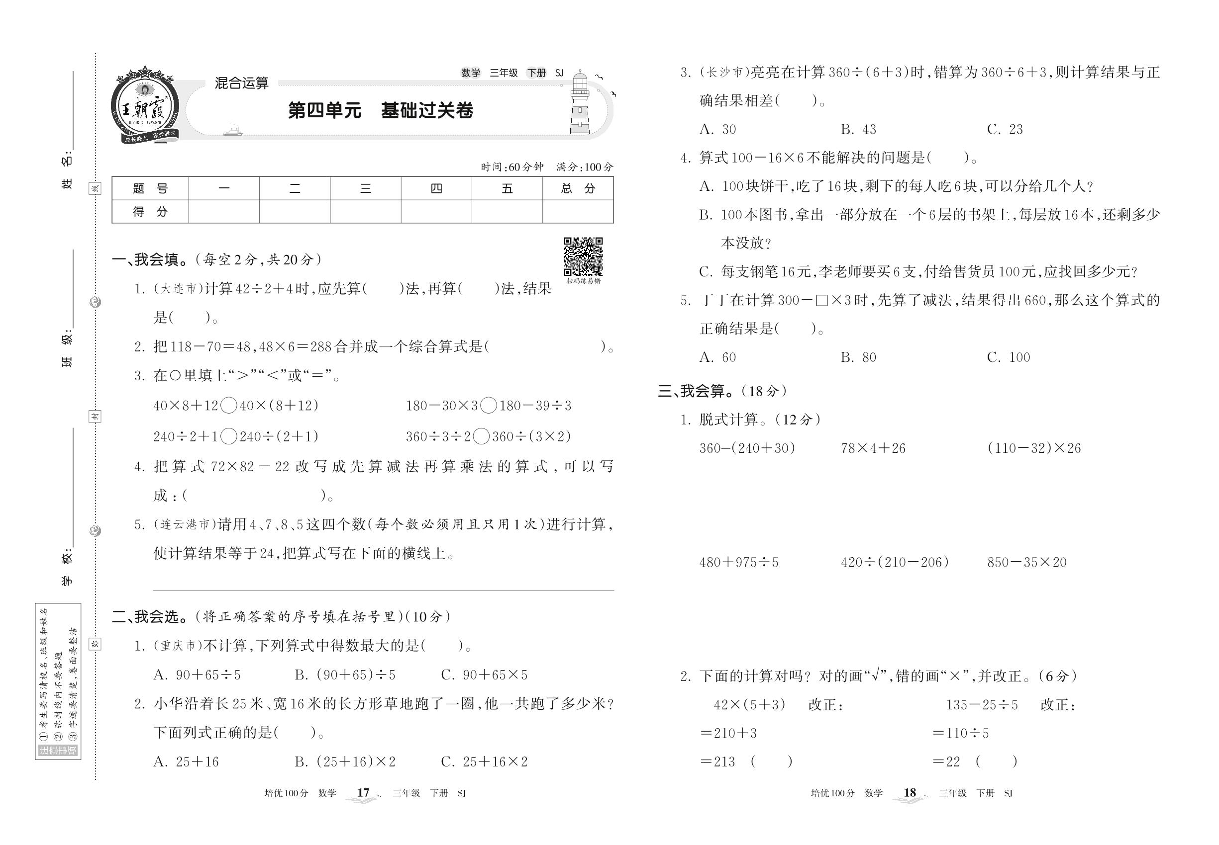 2022下册三年级数学苏教版 第四单元 基础过关卷