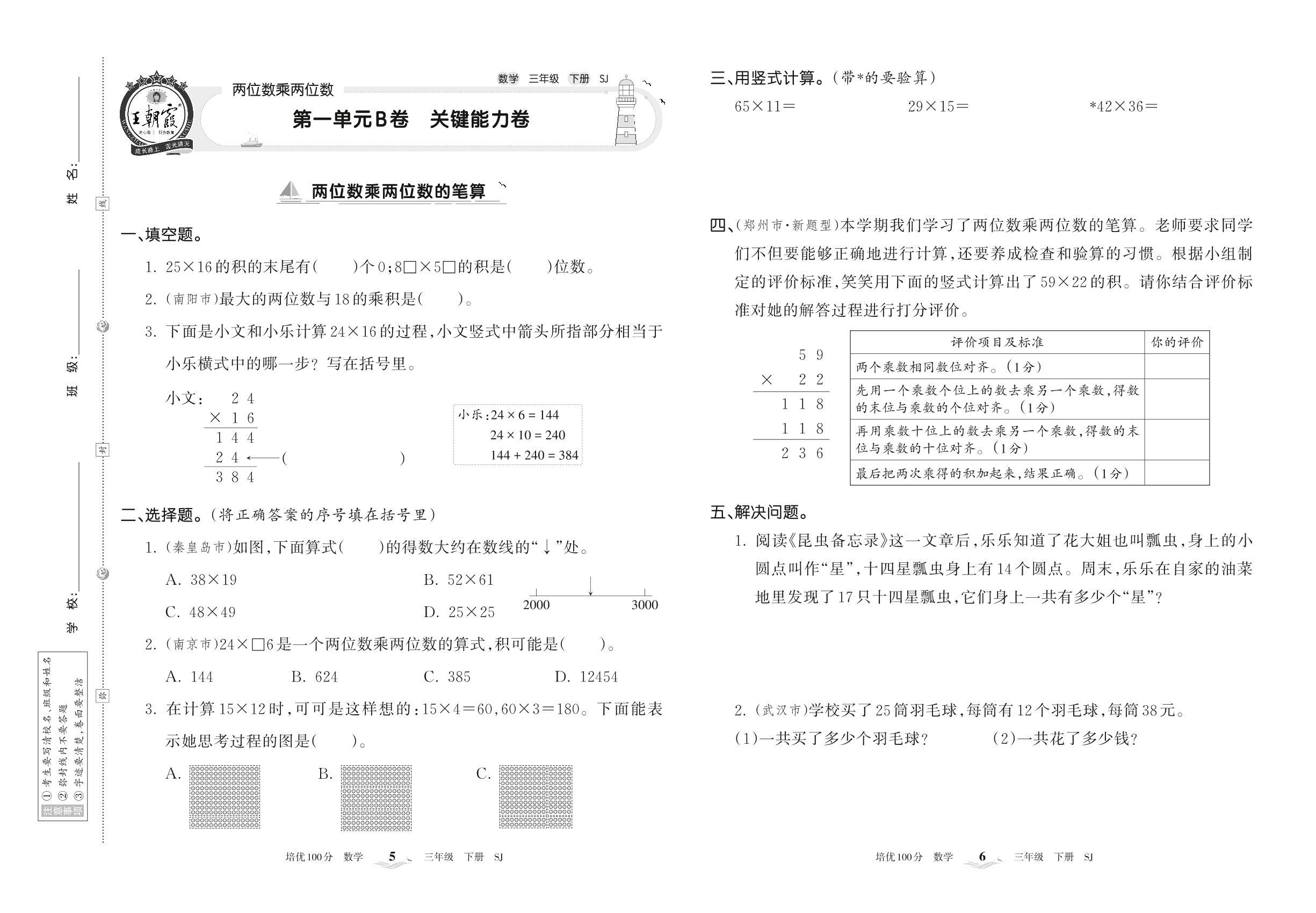2022下册三年级数学苏教版 第一单元B卷 关键能力卷