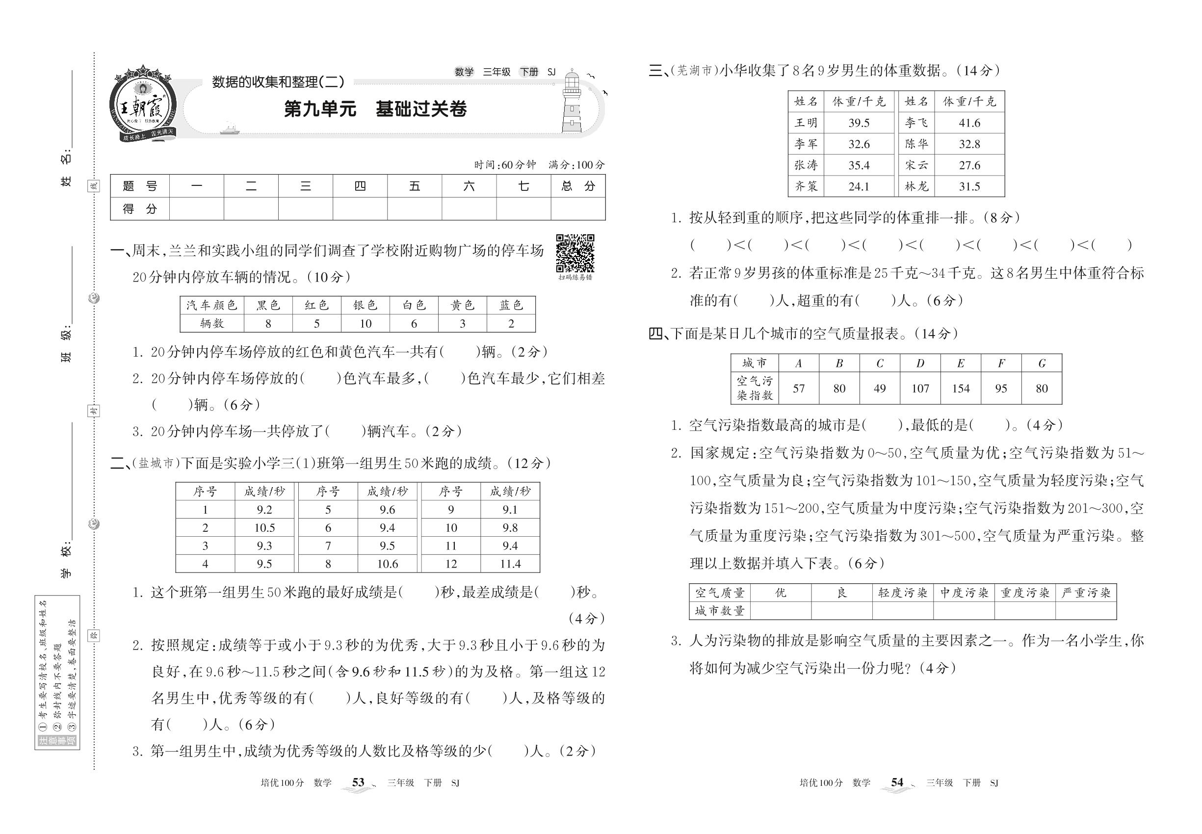2022下册三年级数学苏教版 第九单元 基础过关卷