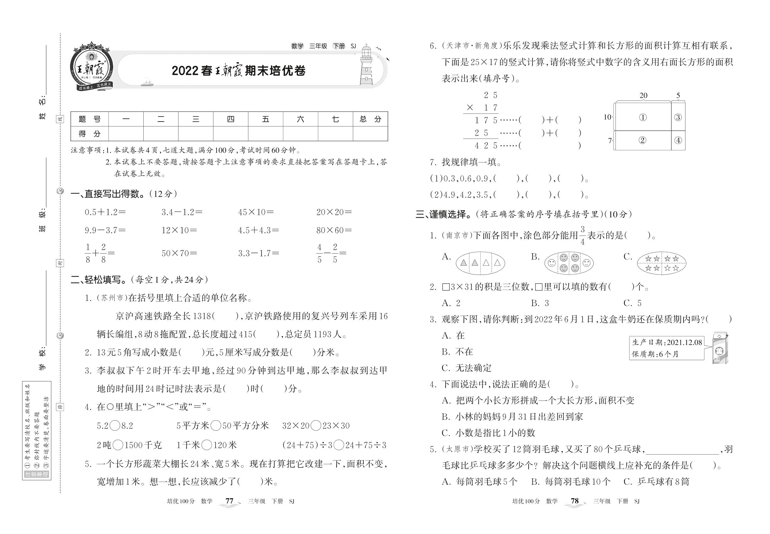2022下册三年级数学苏教版 王朝霞期末培优卷