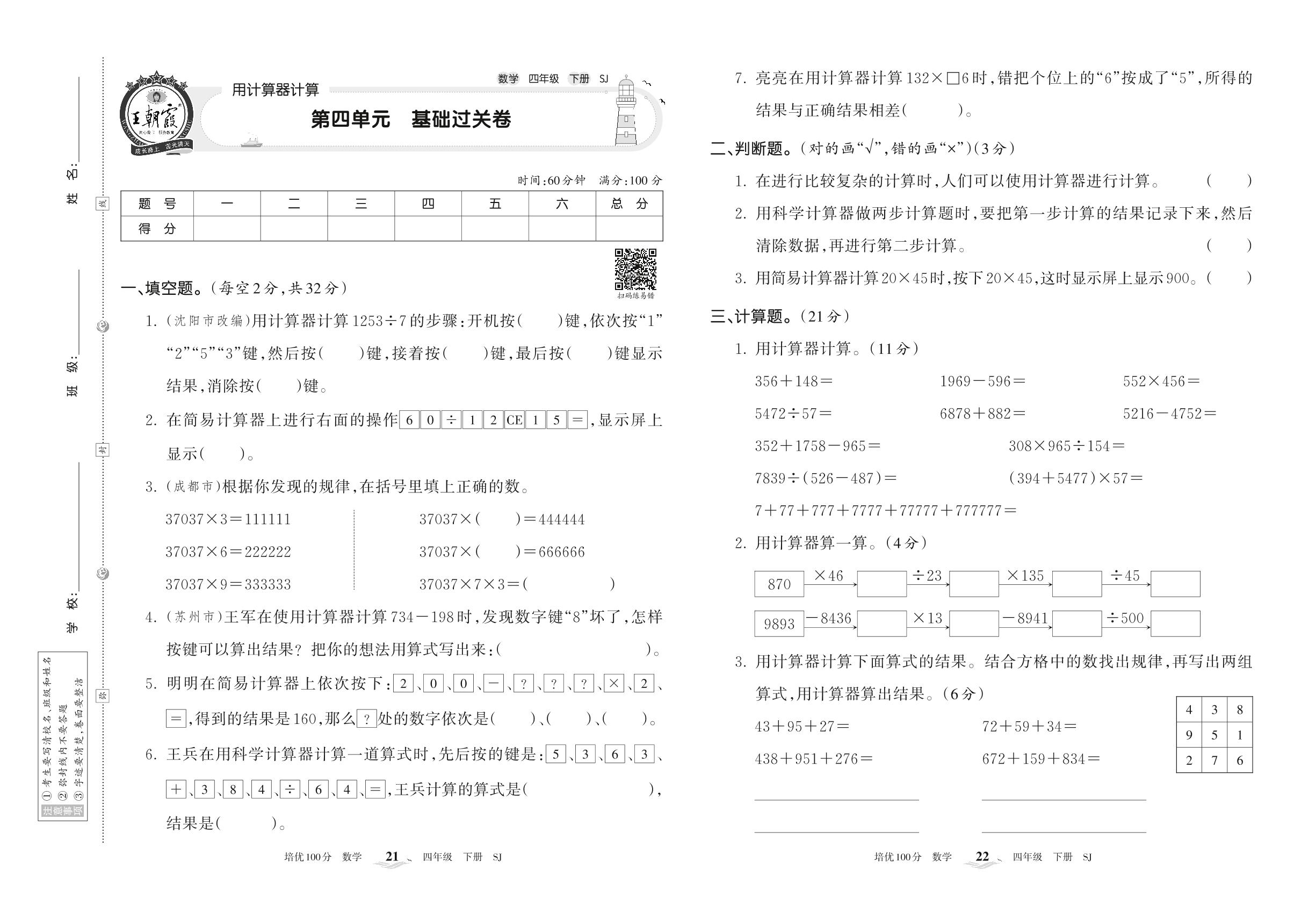 2022下册四年级数学苏教版 第四单元 基础过关卷
