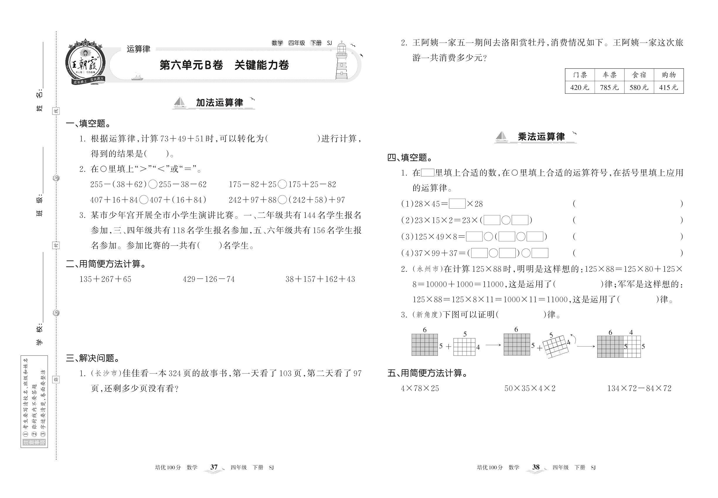 2022下册四年级数学苏教版 第六单元B卷 关键能力卷