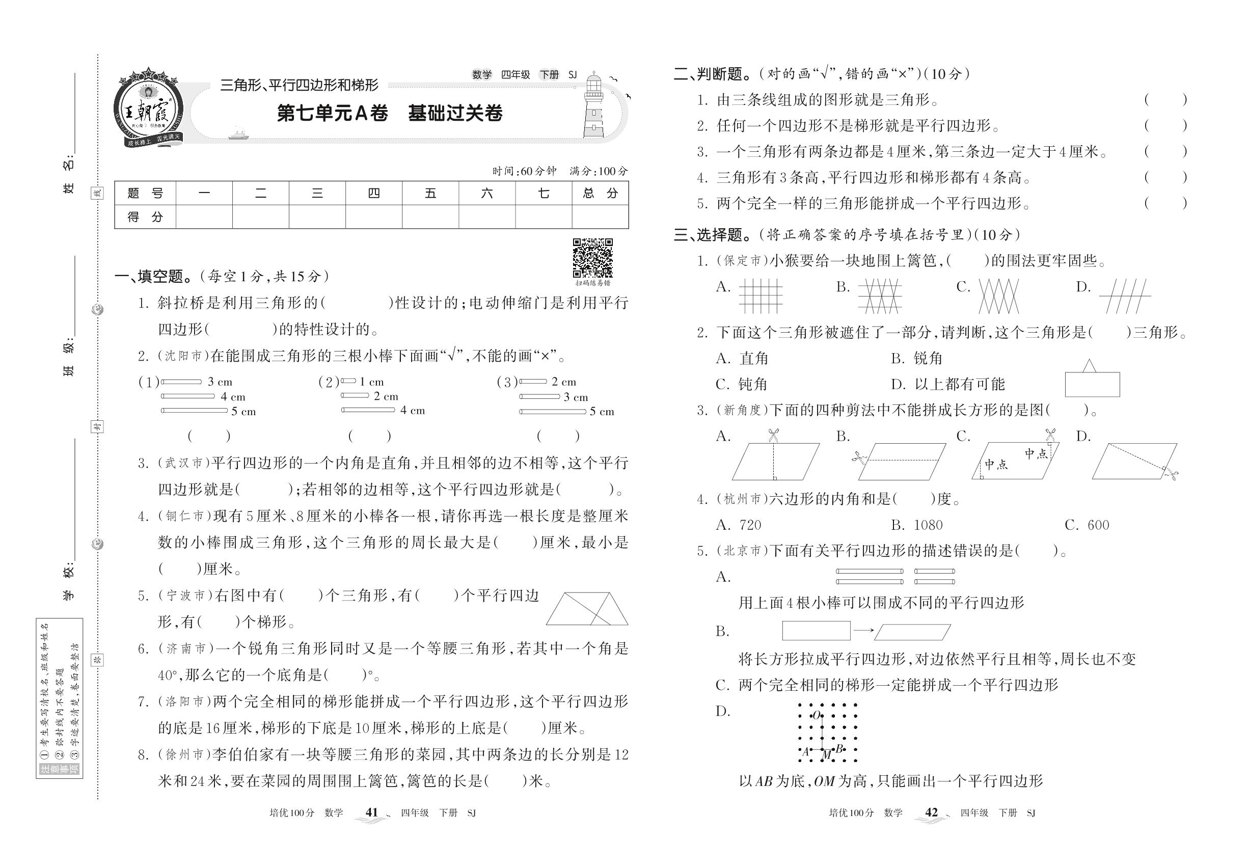 2022下册四年级数学苏教版 第七单元A卷 基础过关卷