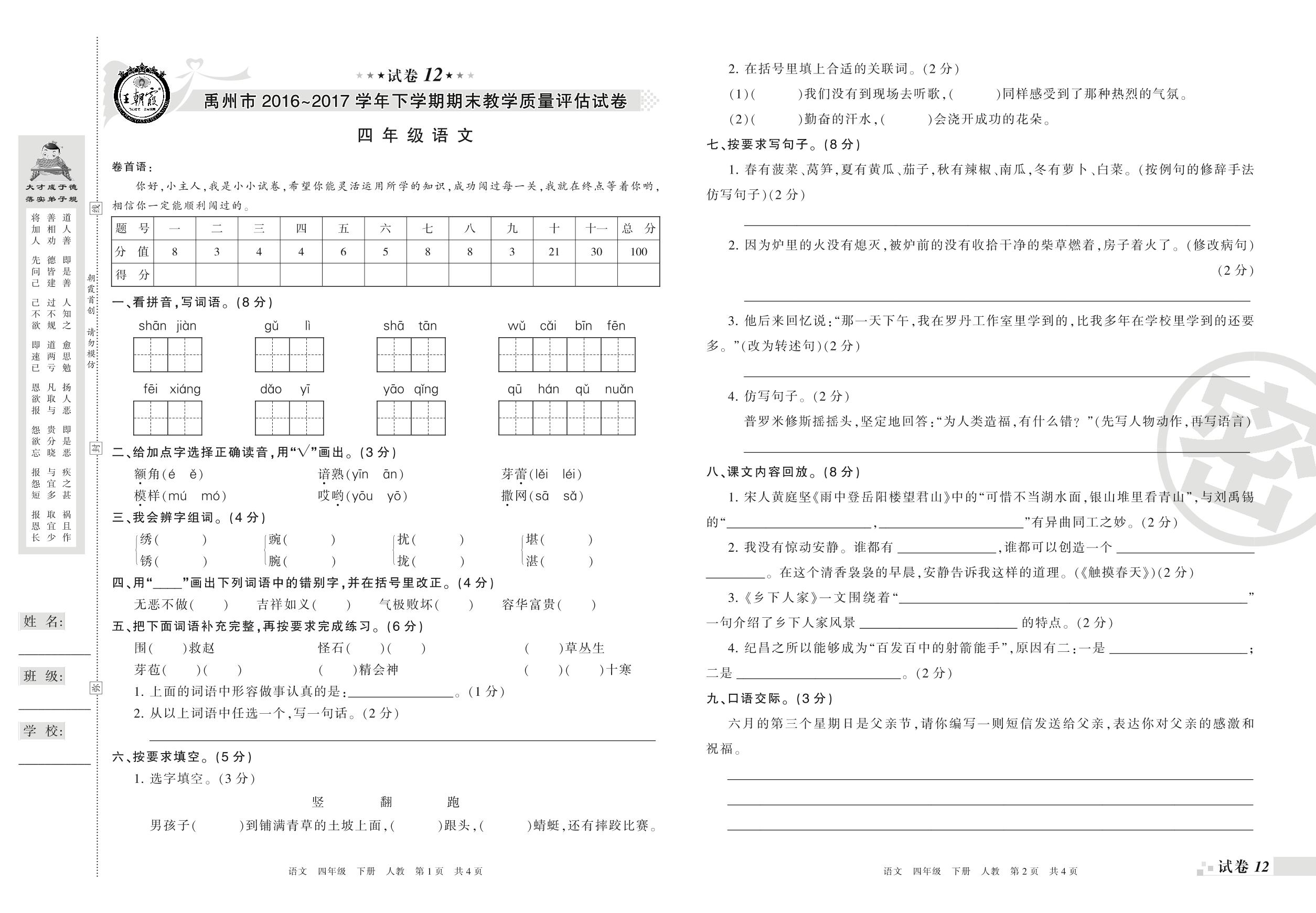 2016-2017学年第二学期禹州市四年级语文试卷(人教版)【12】
