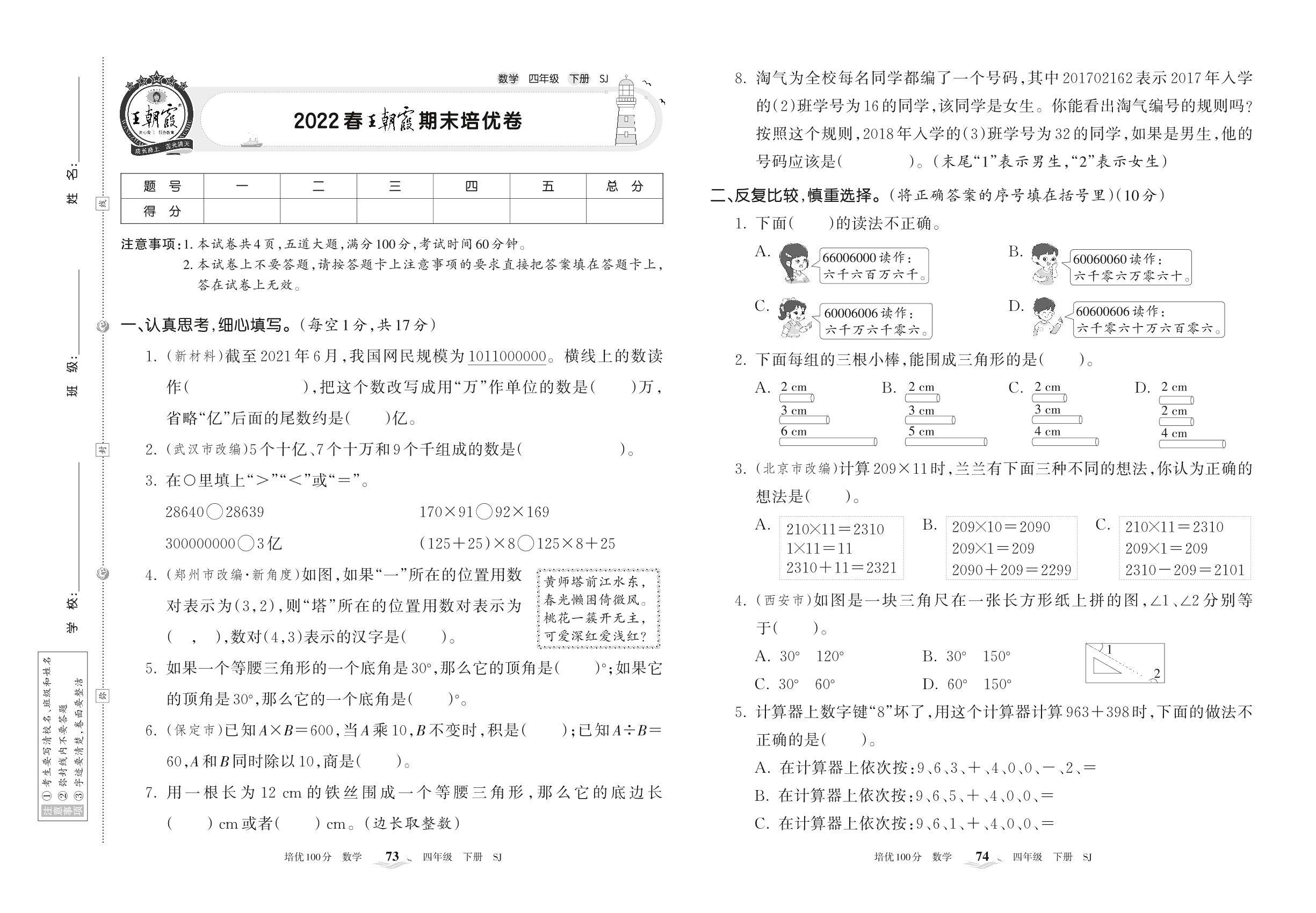 2022下册四年级数学苏教版 王朝霞期末培优卷