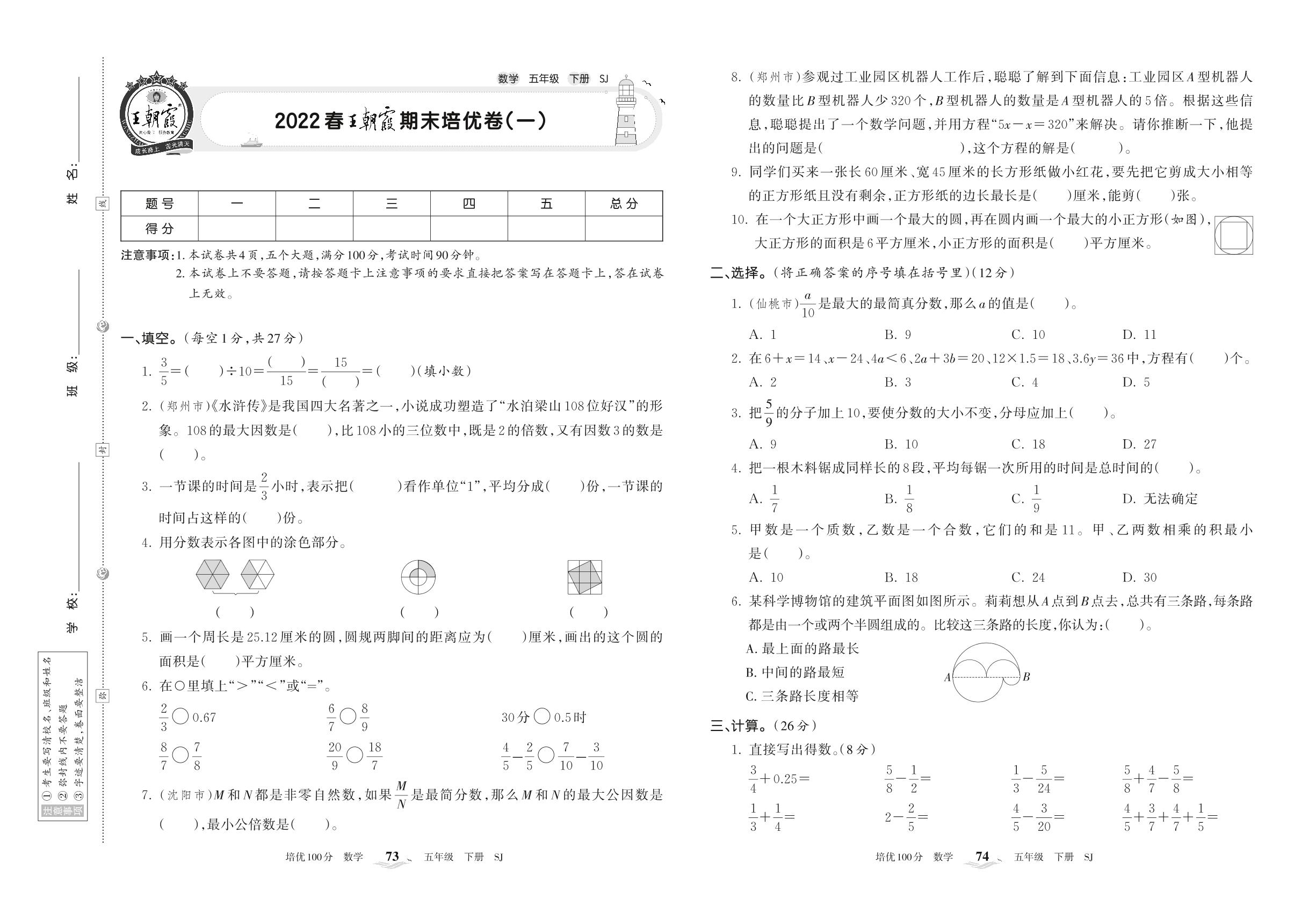 2022下册五年级数学苏教版 王朝霞期末培优卷(一)
