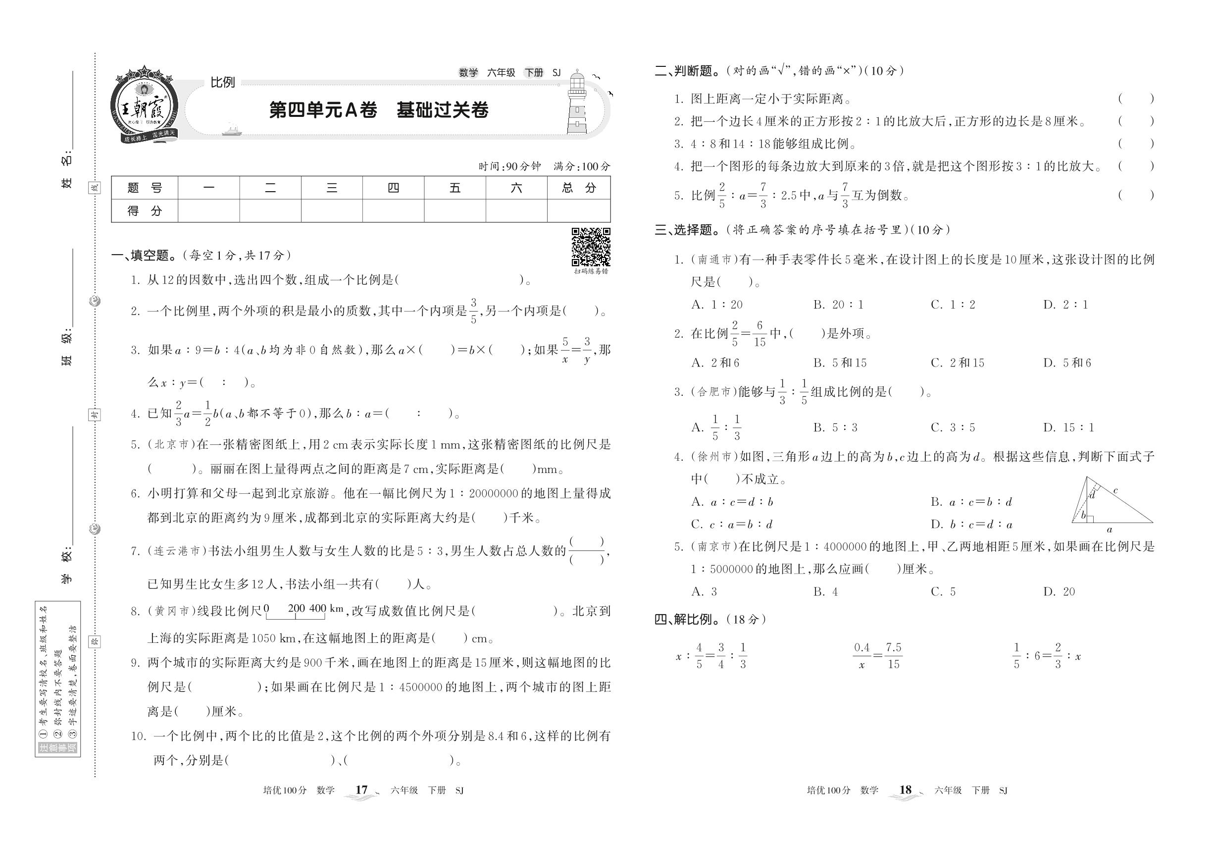 2022下册六年级数学苏教版 第四单元A卷 基础过关卷