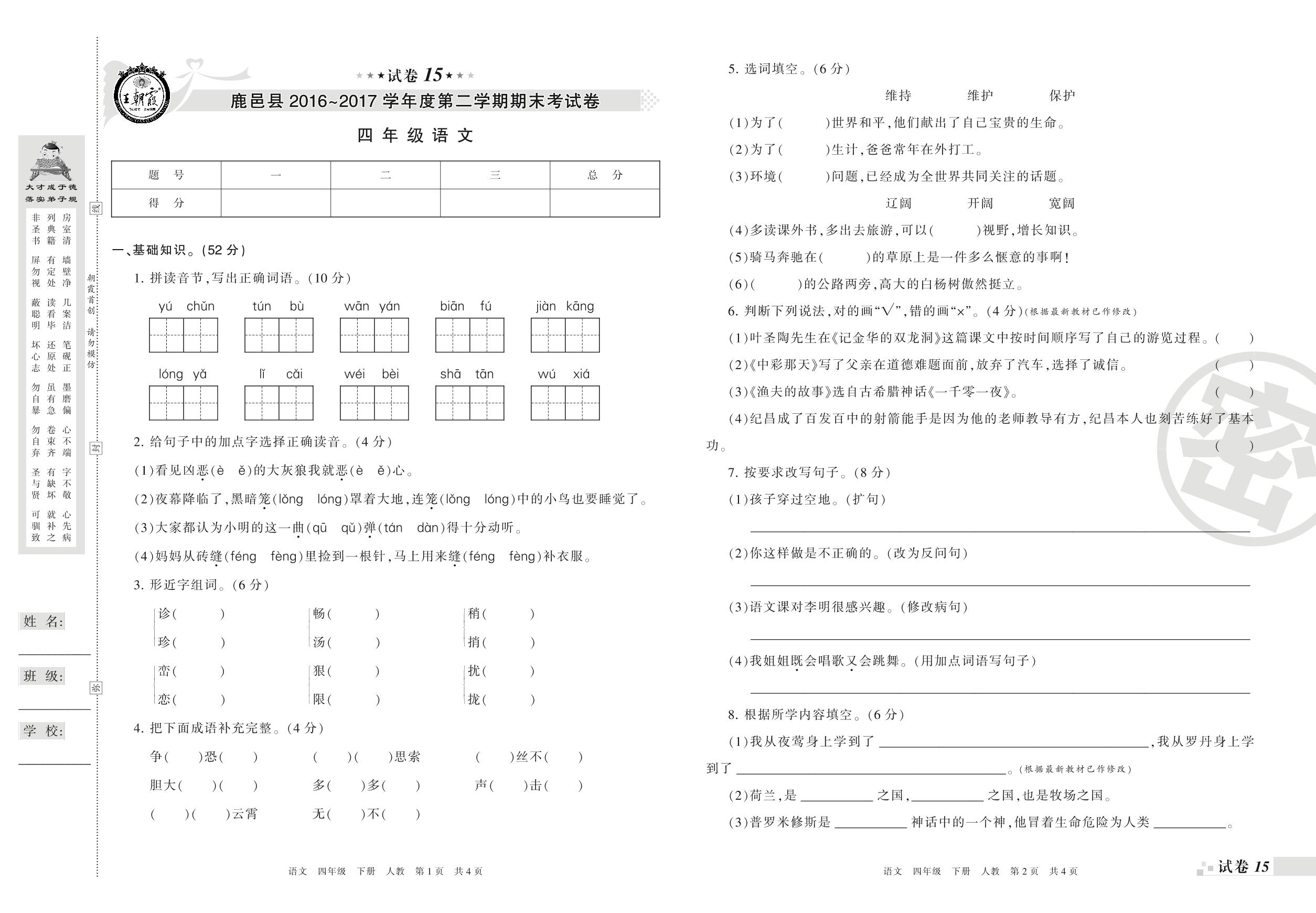 2016-2017学年第二学期周口市鹿邑县四年级语文试卷(人教版)【15】