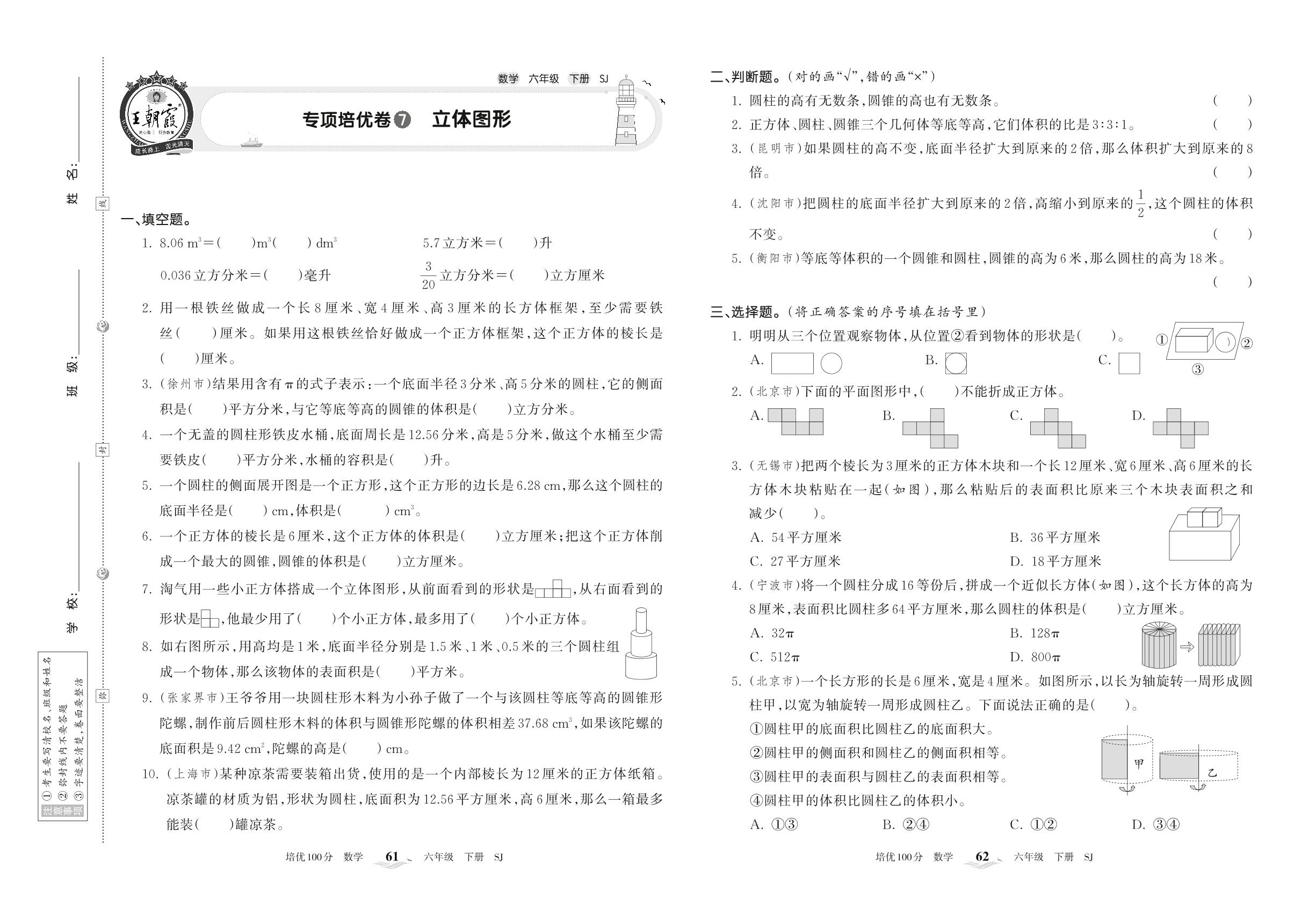 2022下册六年级数学苏教版 专项培优卷7 立体图形