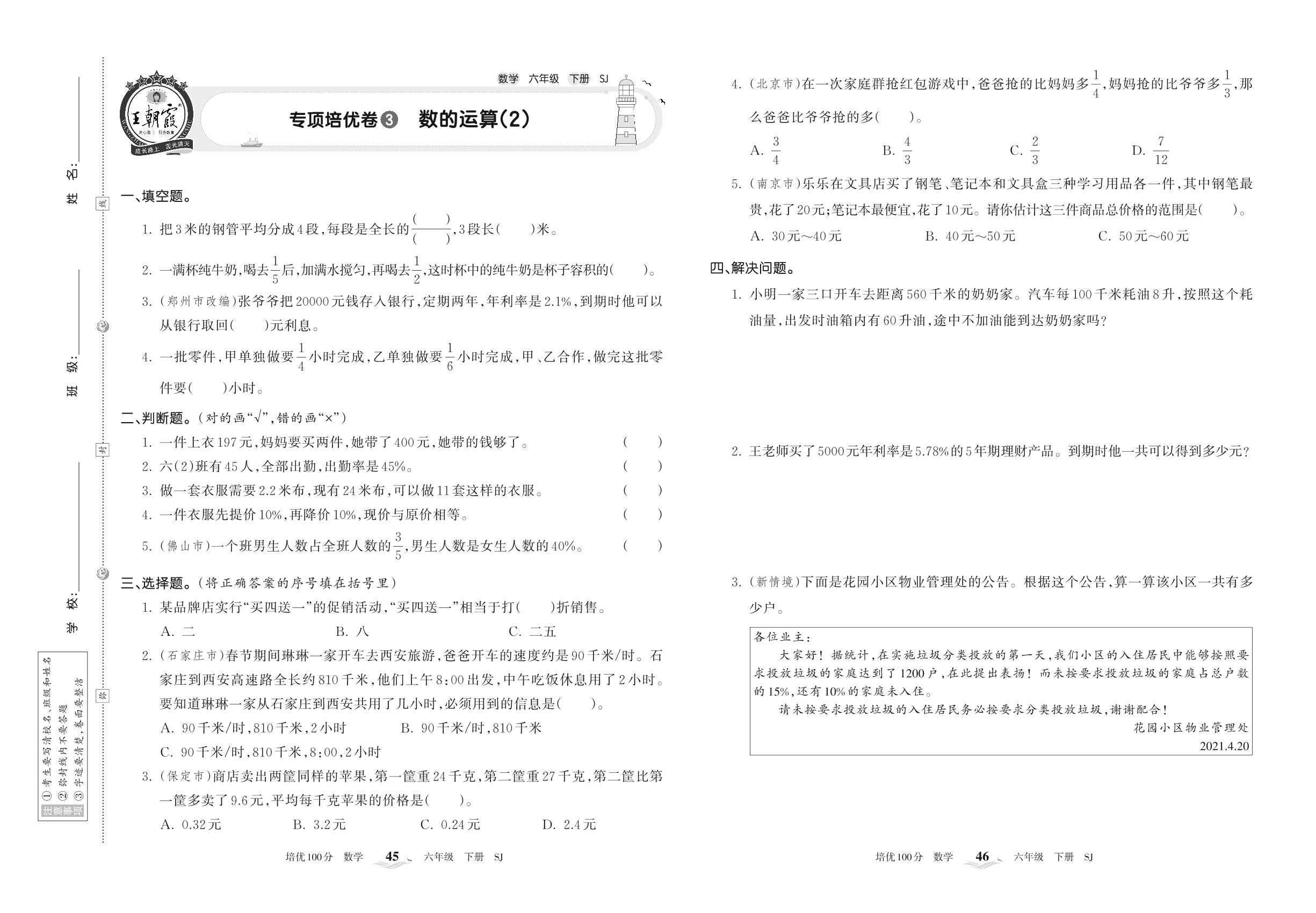 2022下册六年级数学苏教版 专项培优卷3 数的运算(2)