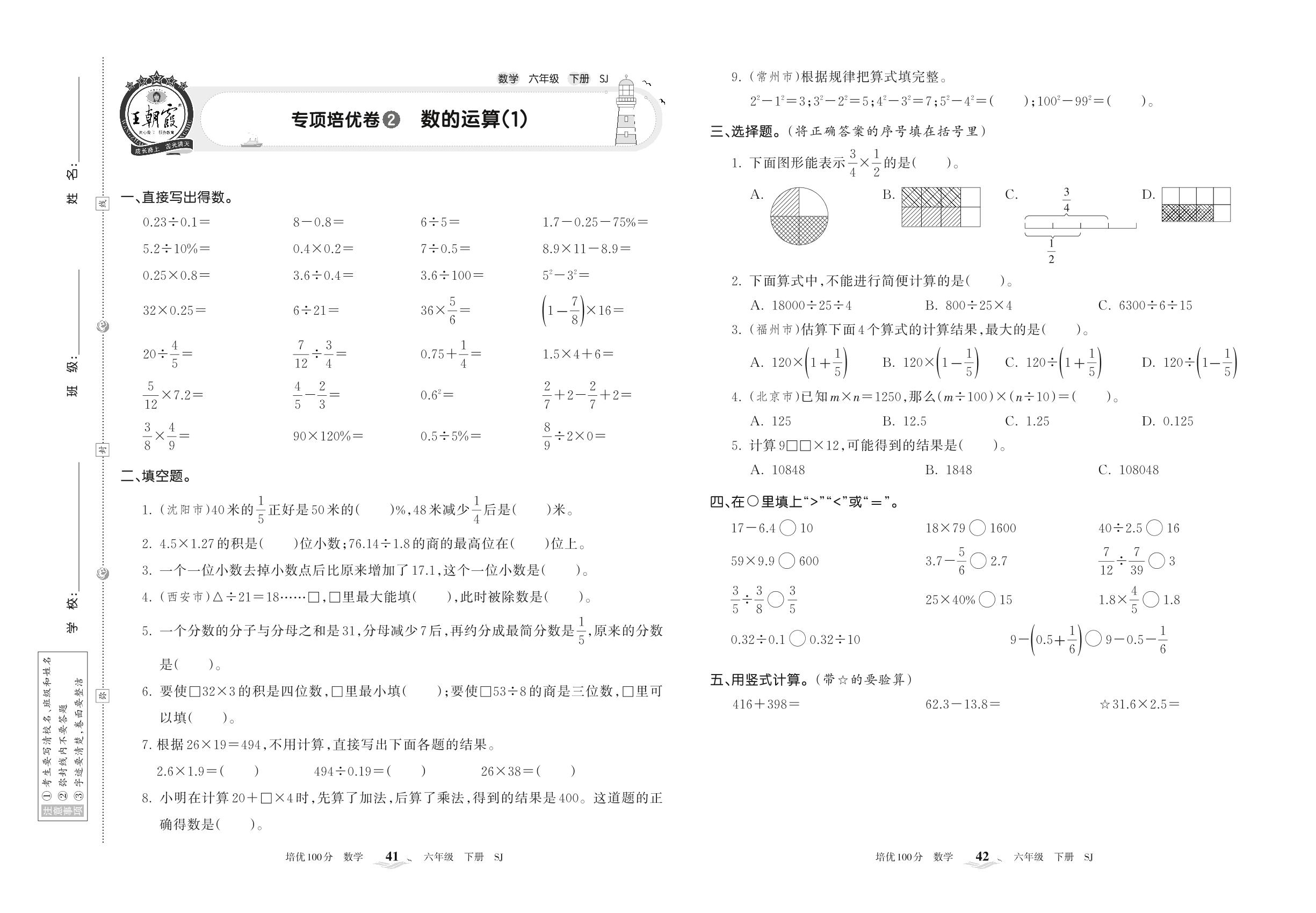 2022下册六年级数学苏教版 专项培优卷2 数的运算(1)