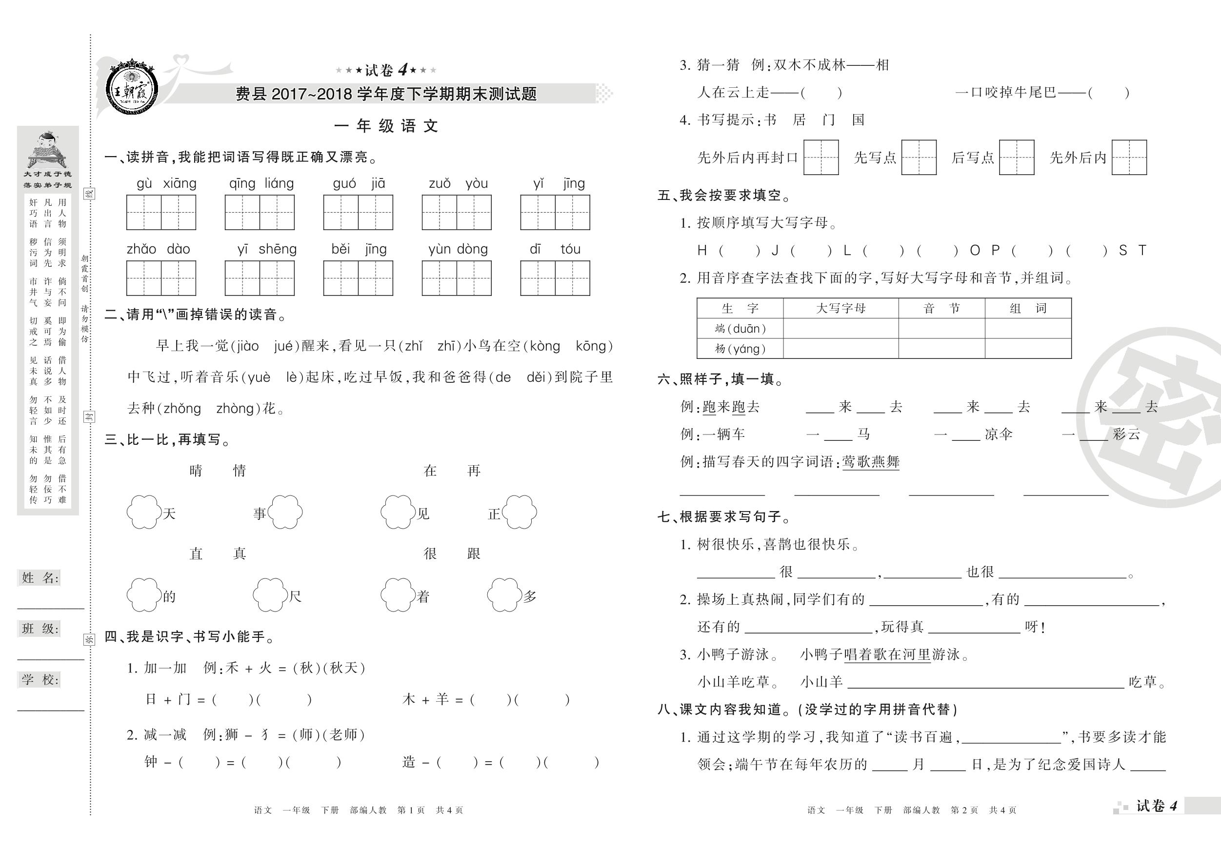 2017-2018学年第二学期临沂市费县一年级语文试卷(人教版)【4】