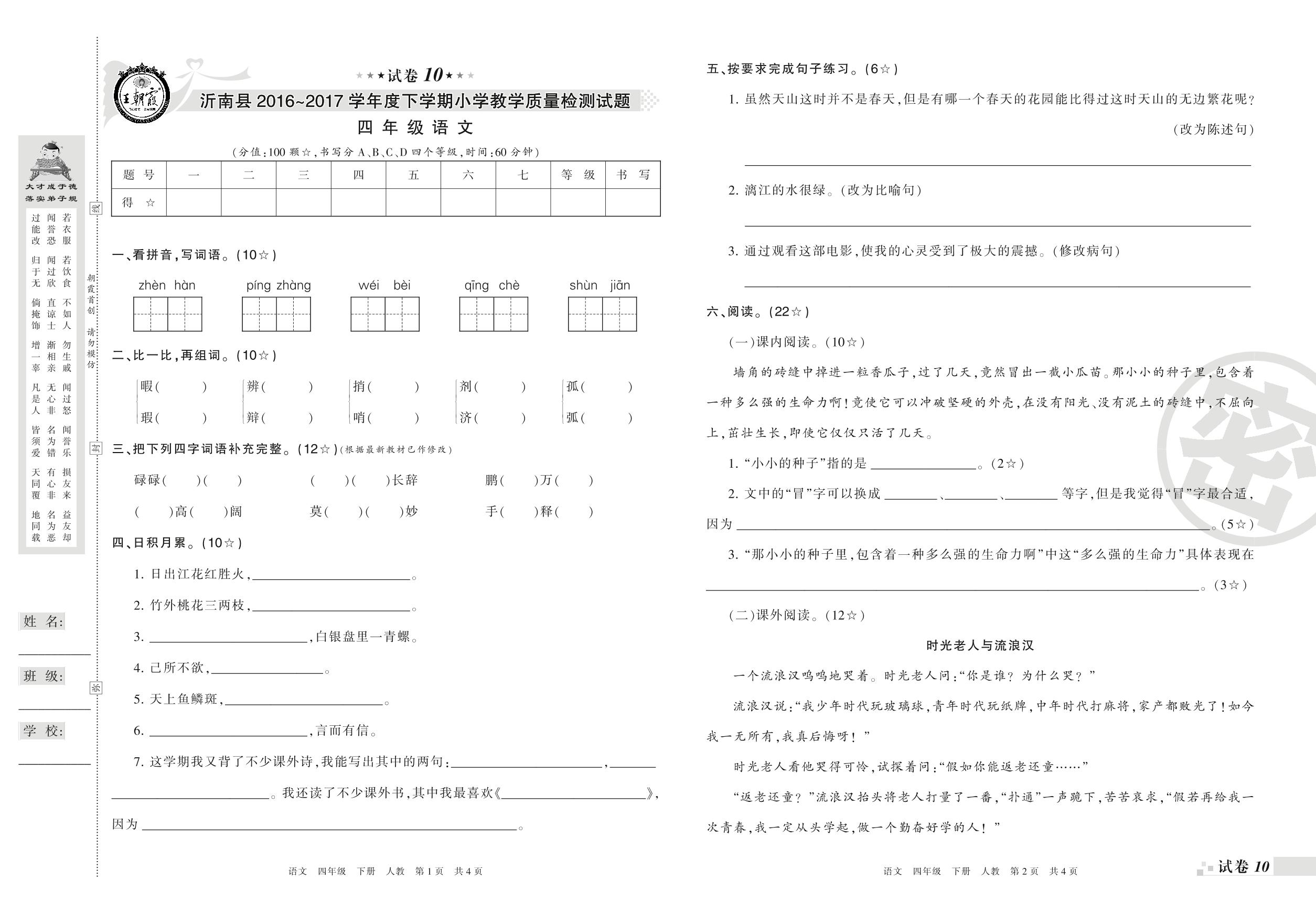 2016-2017学年第二学期临沂市沂南县四年级语文试卷(人教版)【10】