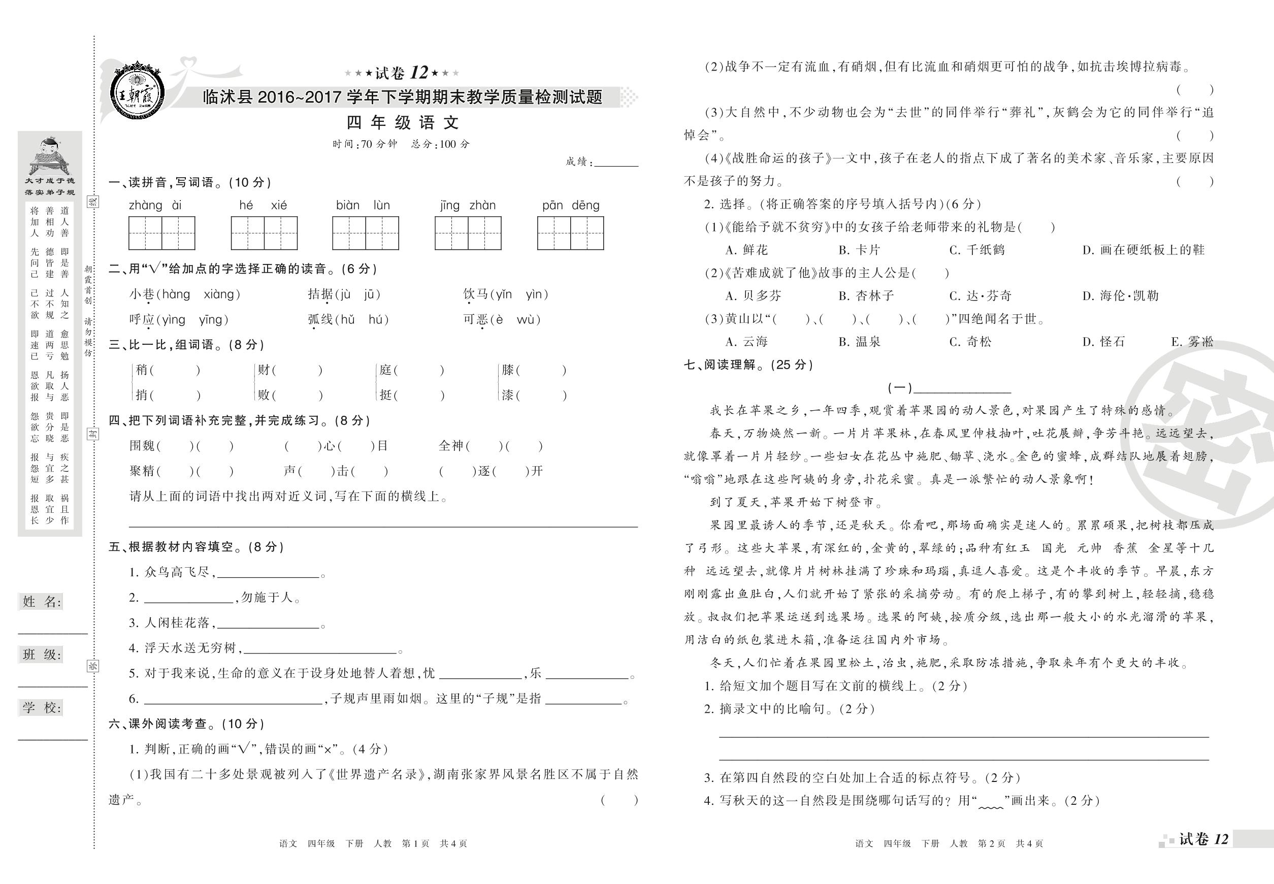 2016-2017学年第二学期临沂市临沭县四年级语文试卷(人教版)【12】