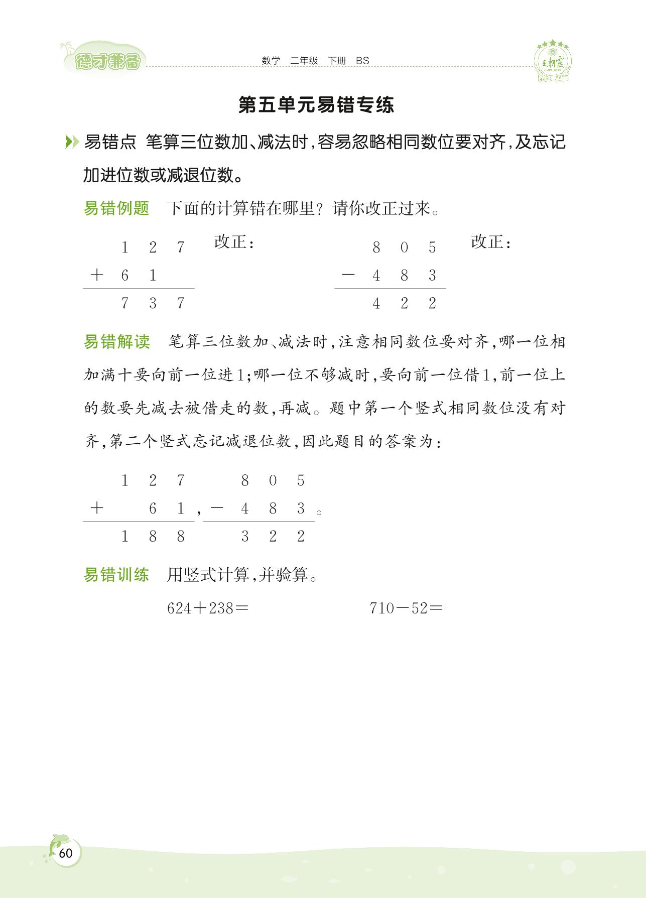 2022下册二年级数学北师版 第五单元 加与减——第五单元易错专练