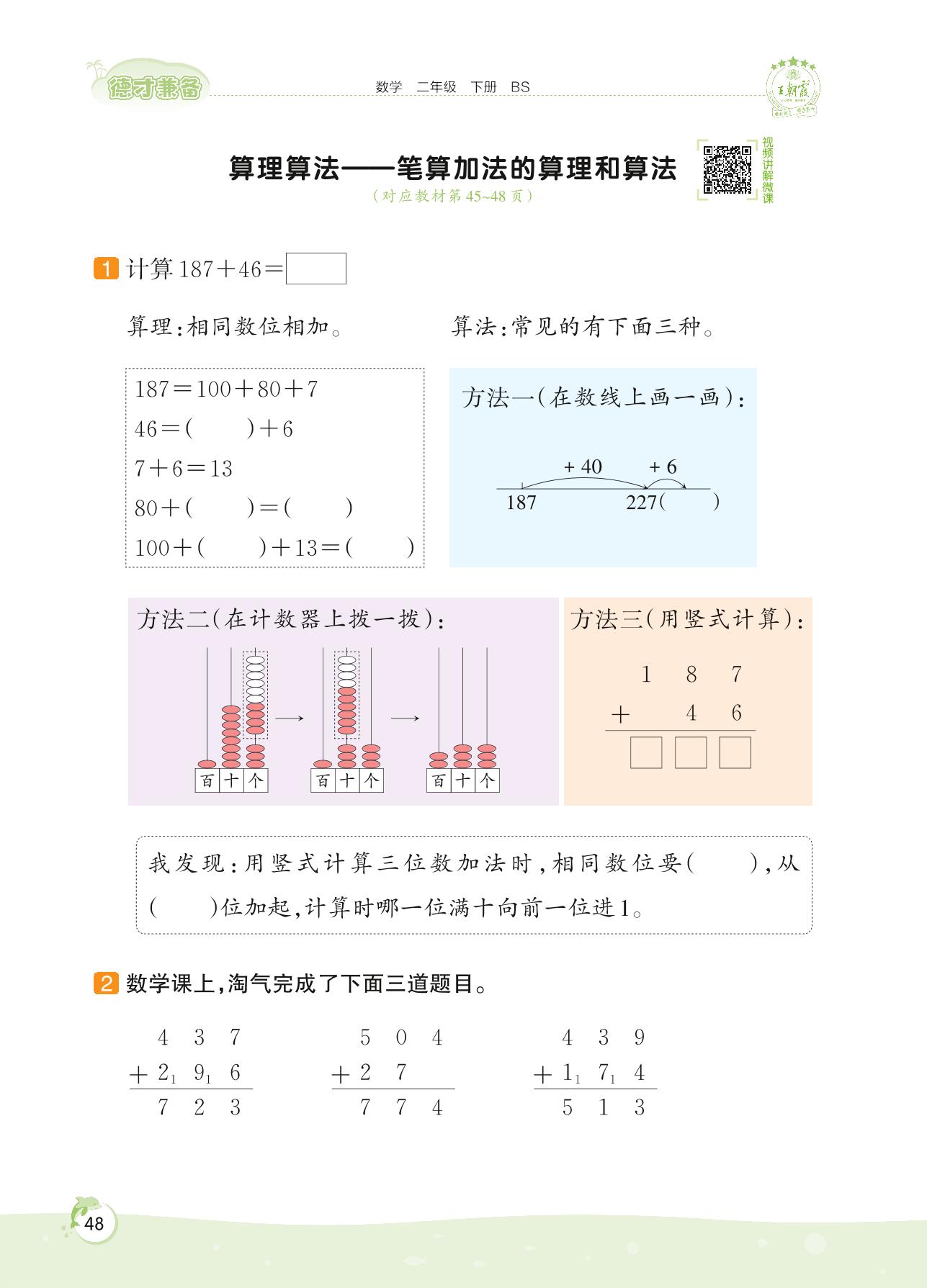 2022下册二年级数学北师版 第五单元 加与减——算理算法 笔算加法的算理和算法