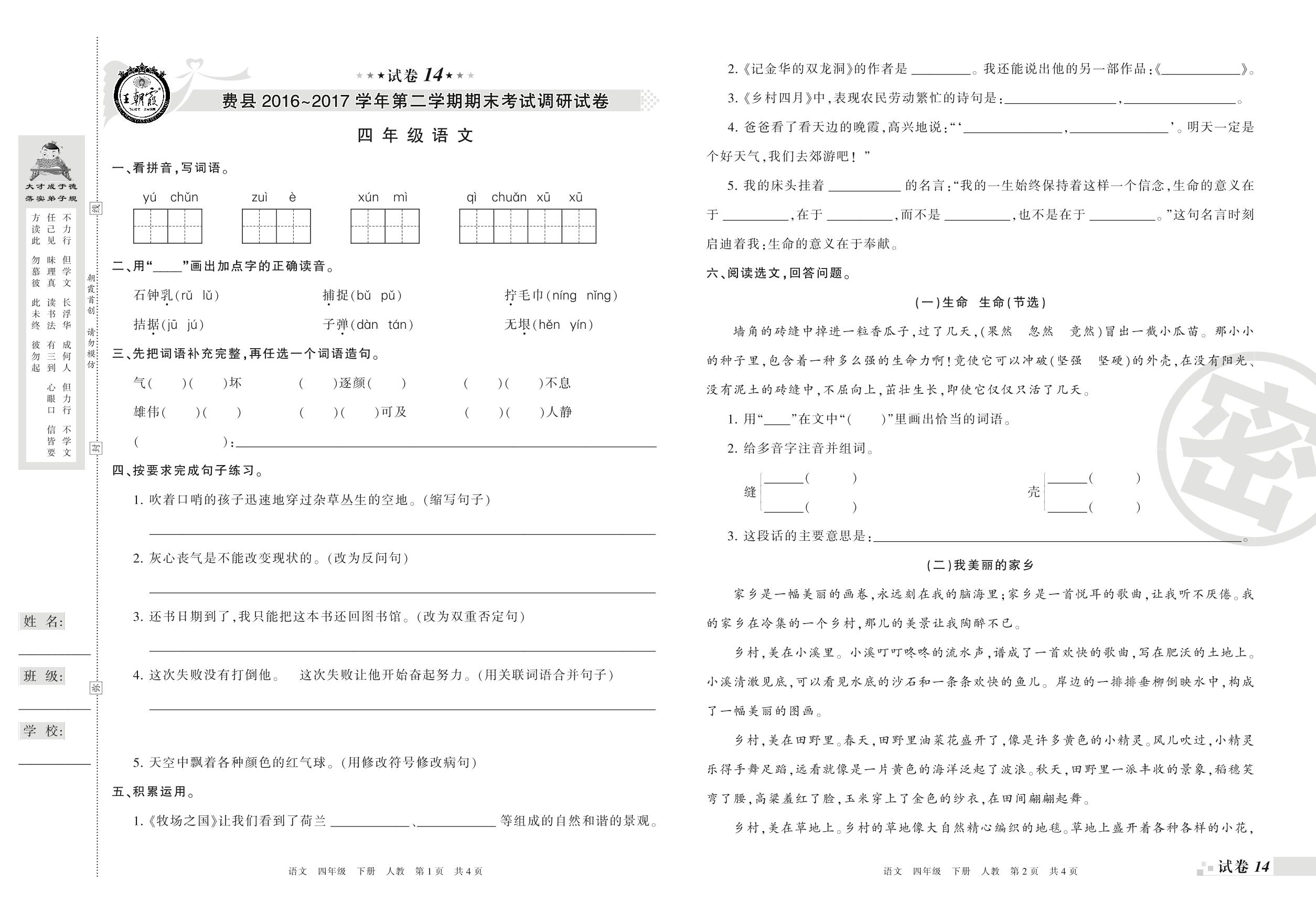 2016-2017学年第二学期临沂市费县四年级语文试卷(人教版)【14】