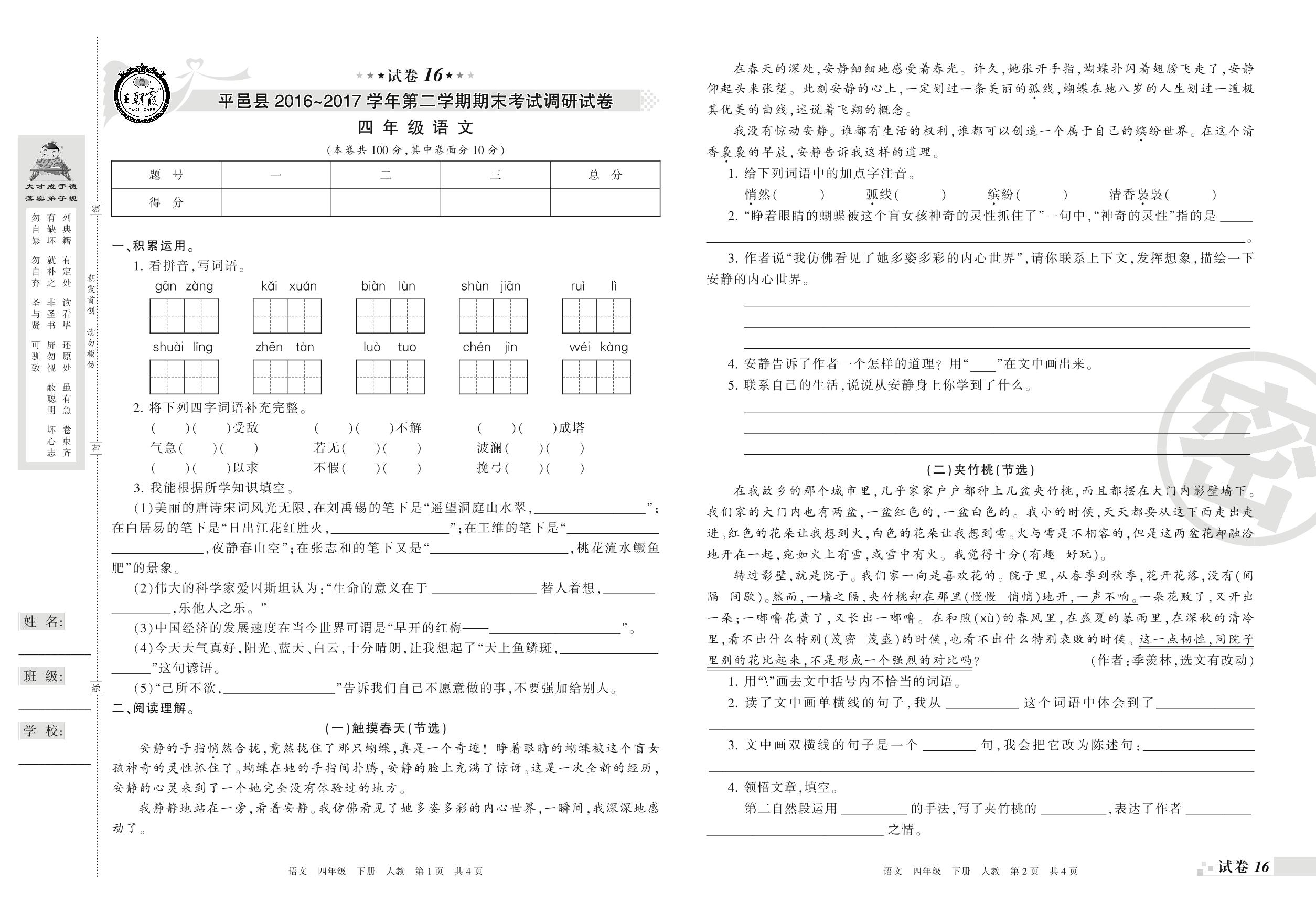 2016-2017学年第二学期临沂市平邑县四年级语文试卷(人教版)【16】