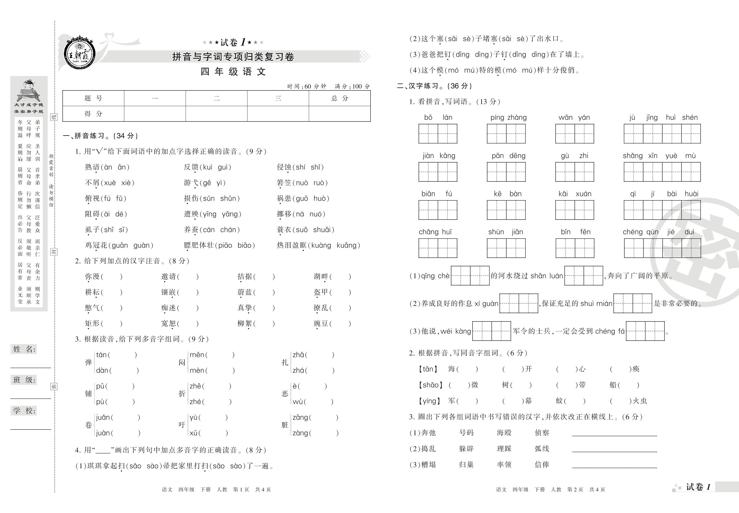 王朝霞期末专项卷——拼音与字词专项归类复习卷四年级下册语文(人教版)_R210801230250【1】