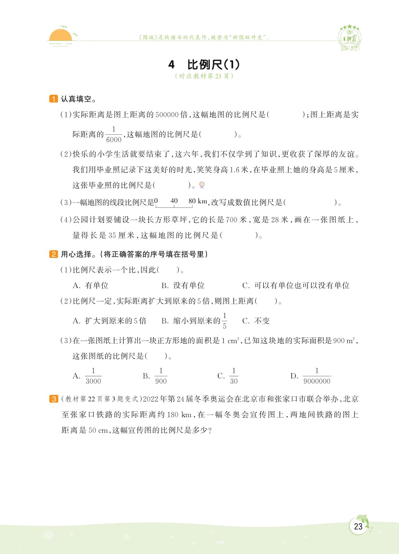 2022下册六年级数学北师版 第二单元 比例——4 比例尺(1)
