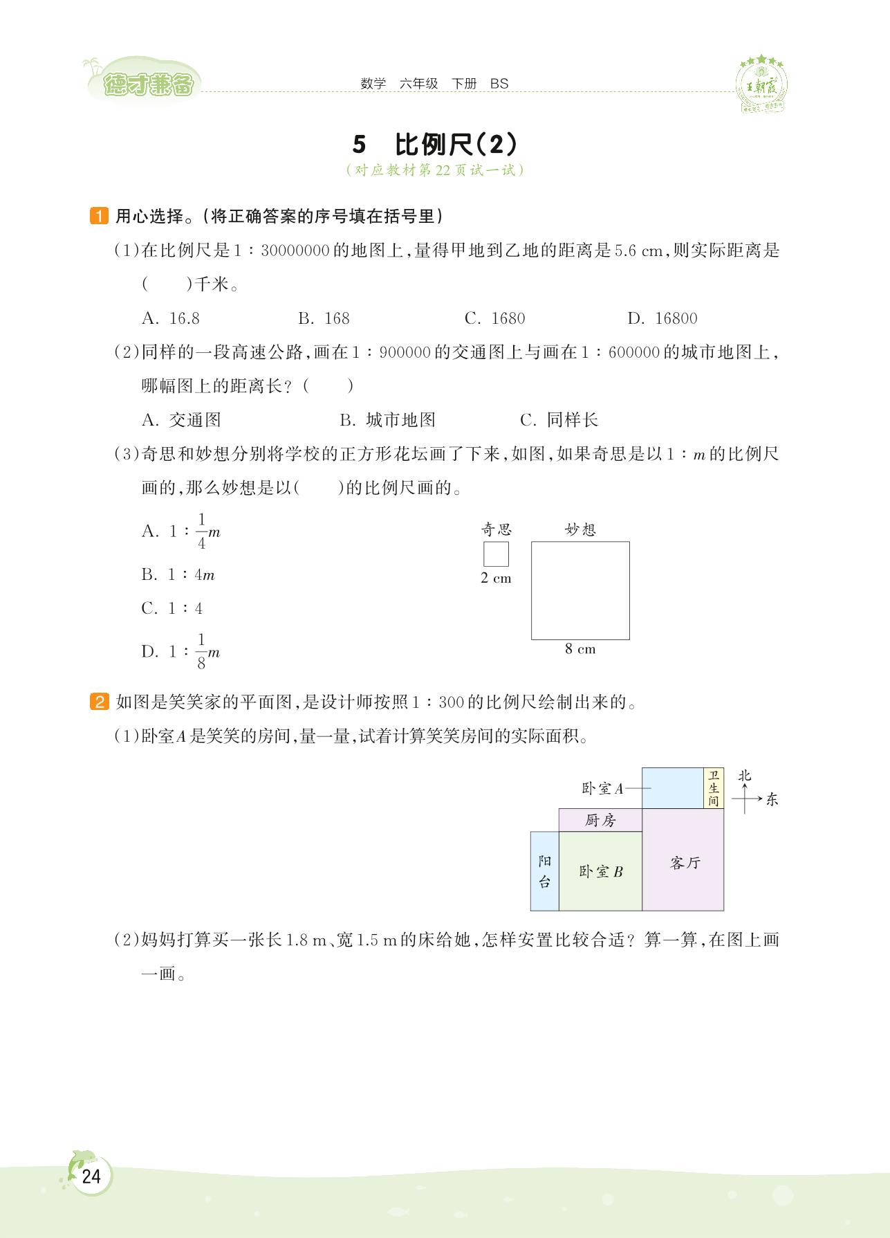 2022下册六年级数学北师版 第二单元 比例——5 比例尺(2)