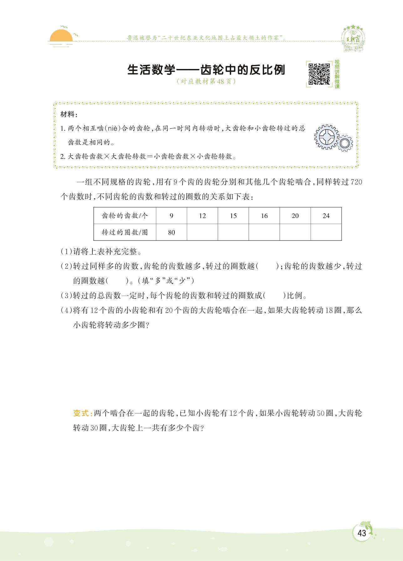 2022下册六年级数学北师版 第四单元 正比例与反比例——生活数学 齿轮中的反比例