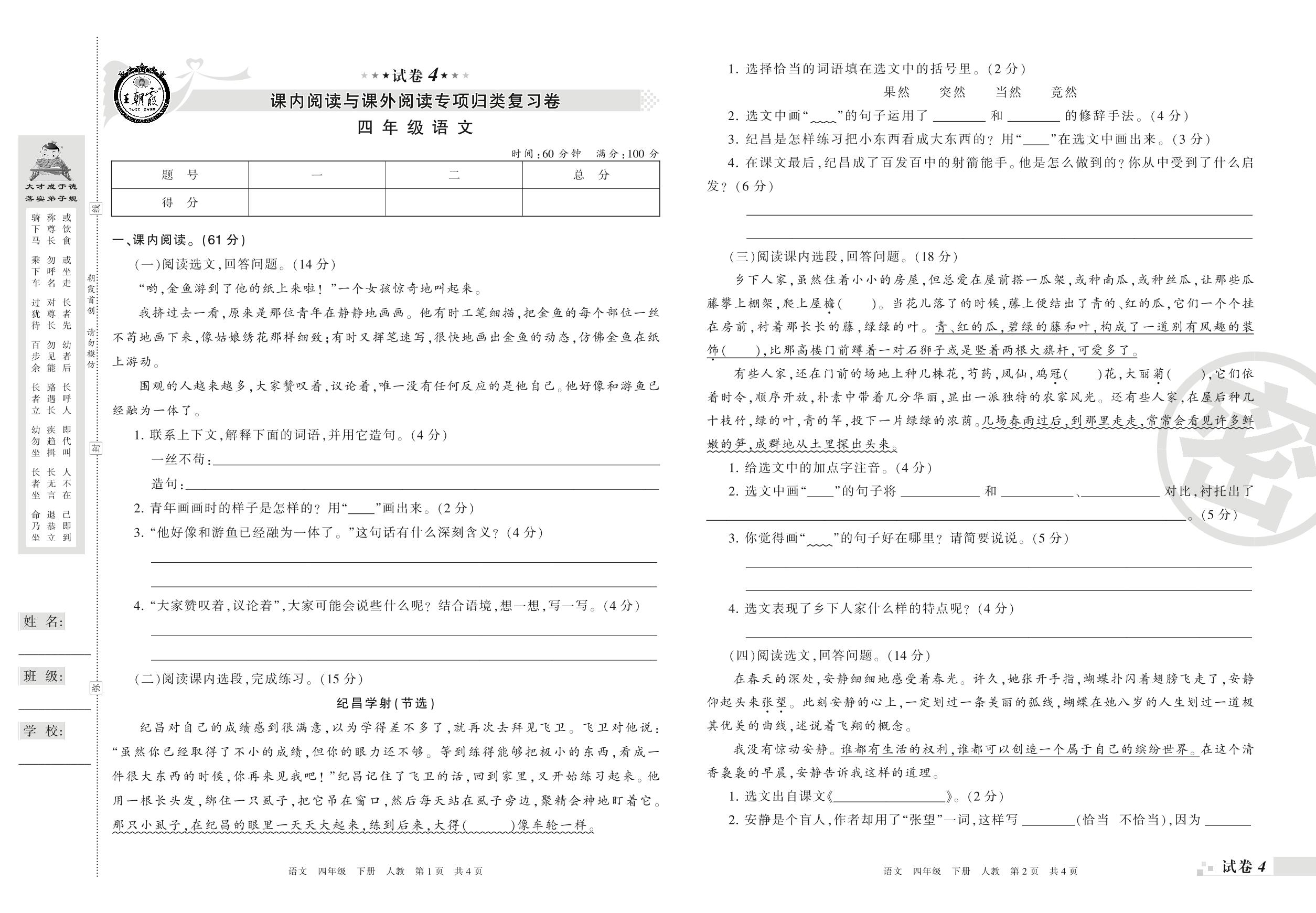 王朝霞期末专项卷——课内阅读与课外阅读专项归类复习卷四年级下册语文(人教版)_R210801230257【4】