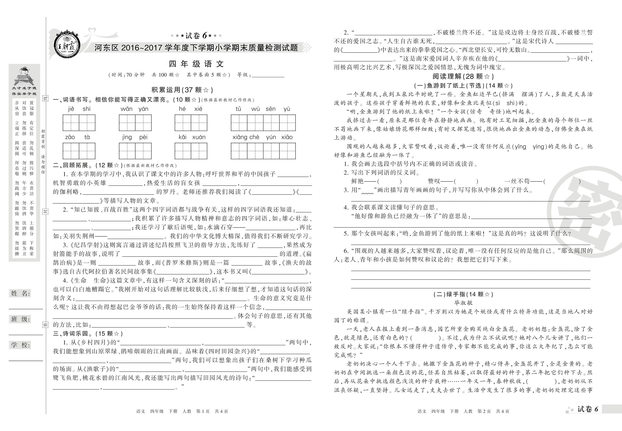 四年级语文人教版下册期末卷