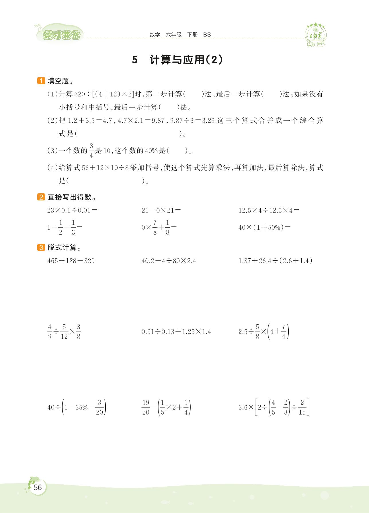 2022下册六年级数学北师版 总复习 数与代数——5 计算与应用(2)