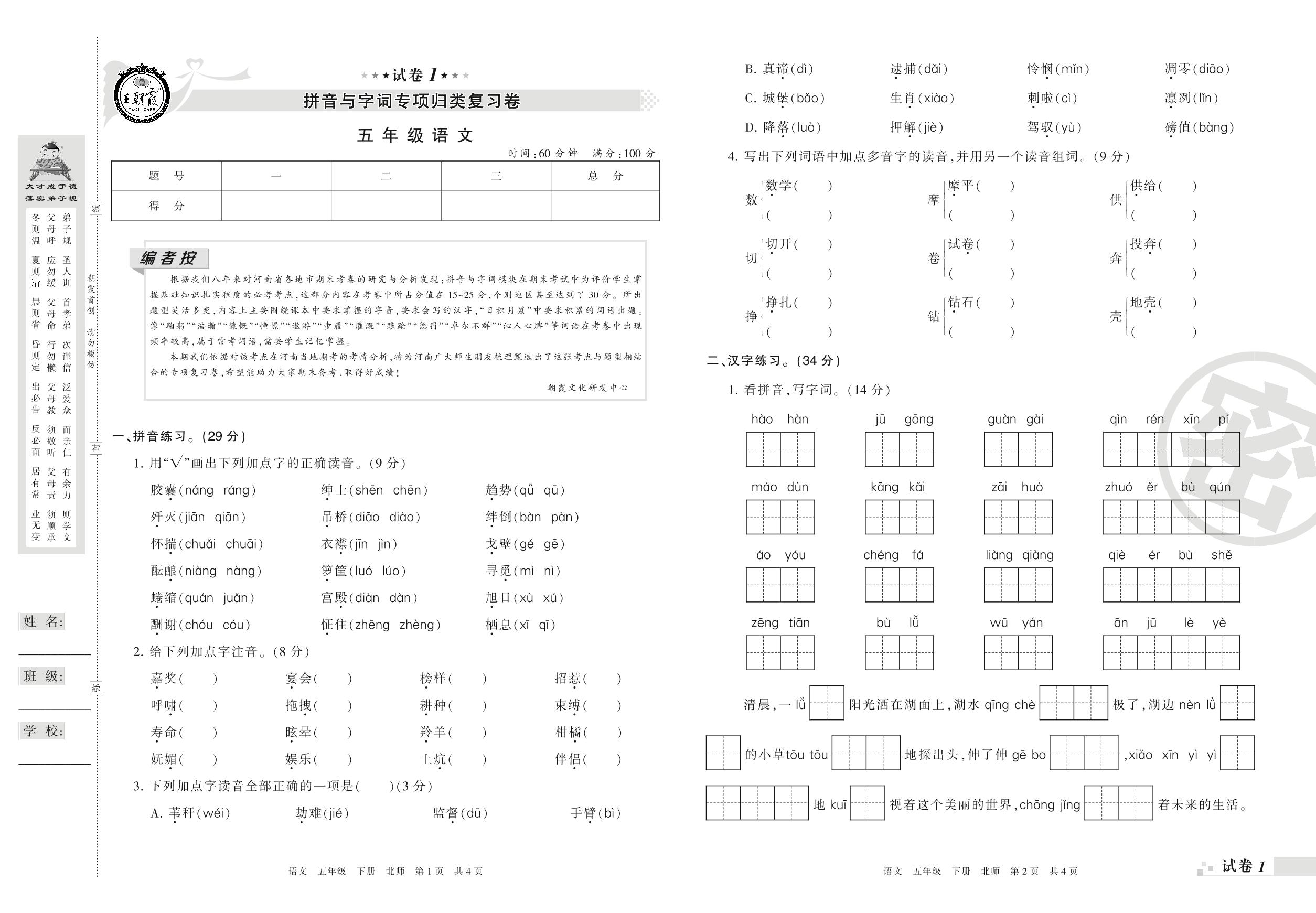 王朝霞期末专项卷——拼音与字词专项归类复习卷五年级下册语文(北师版)_R210801230313【1】
