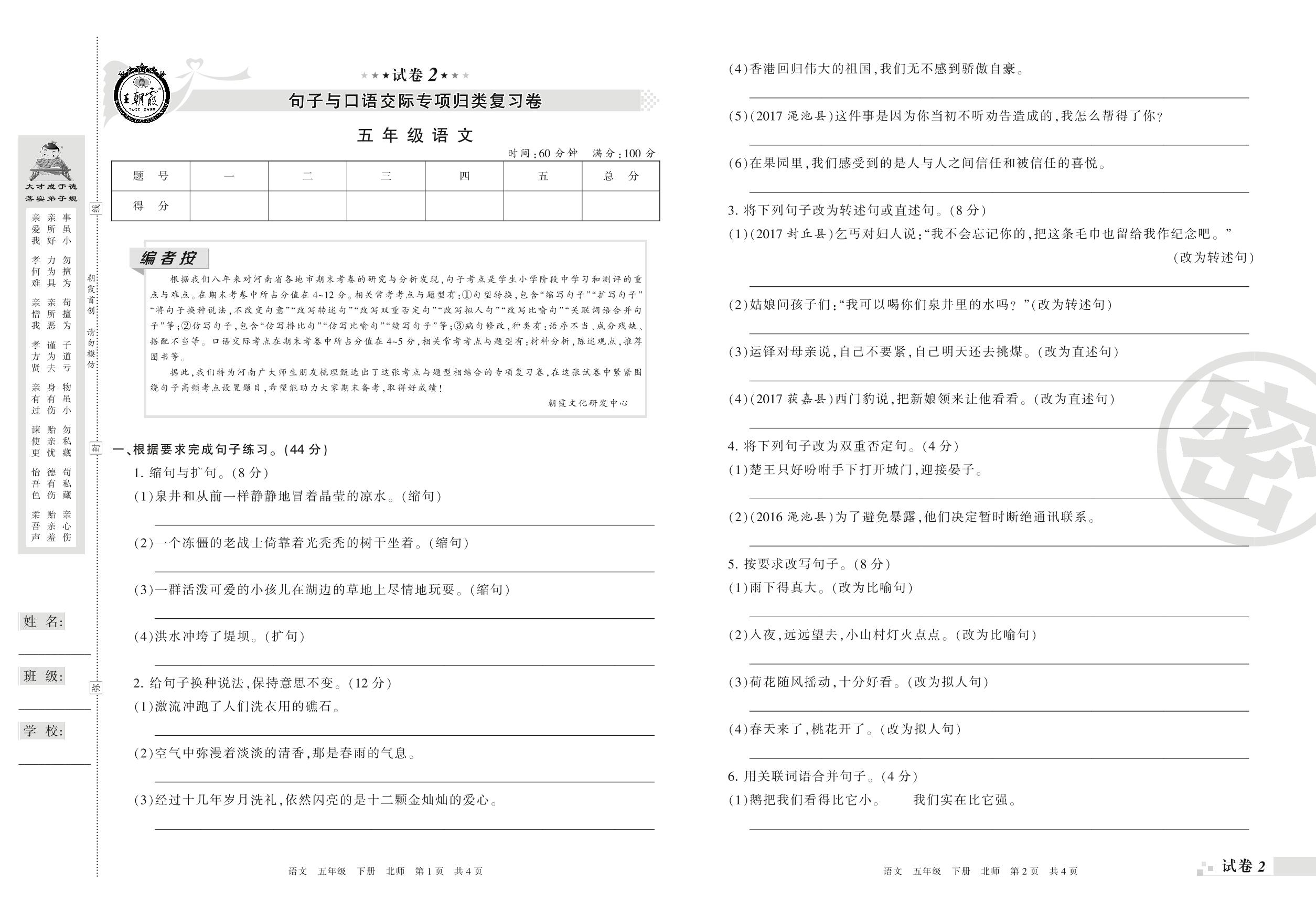 王朝霞期末专项卷——句子与口语交际专项归类复习卷五年级下册语文(北师版)_R210801230315【2】