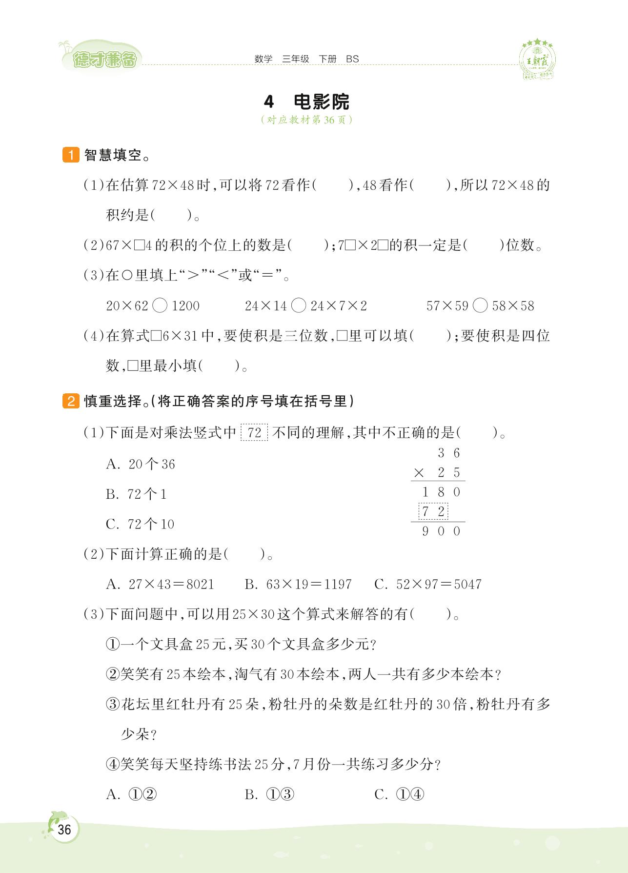 2022下册三年级数学北师版 第三单元 乘法——4 电影院