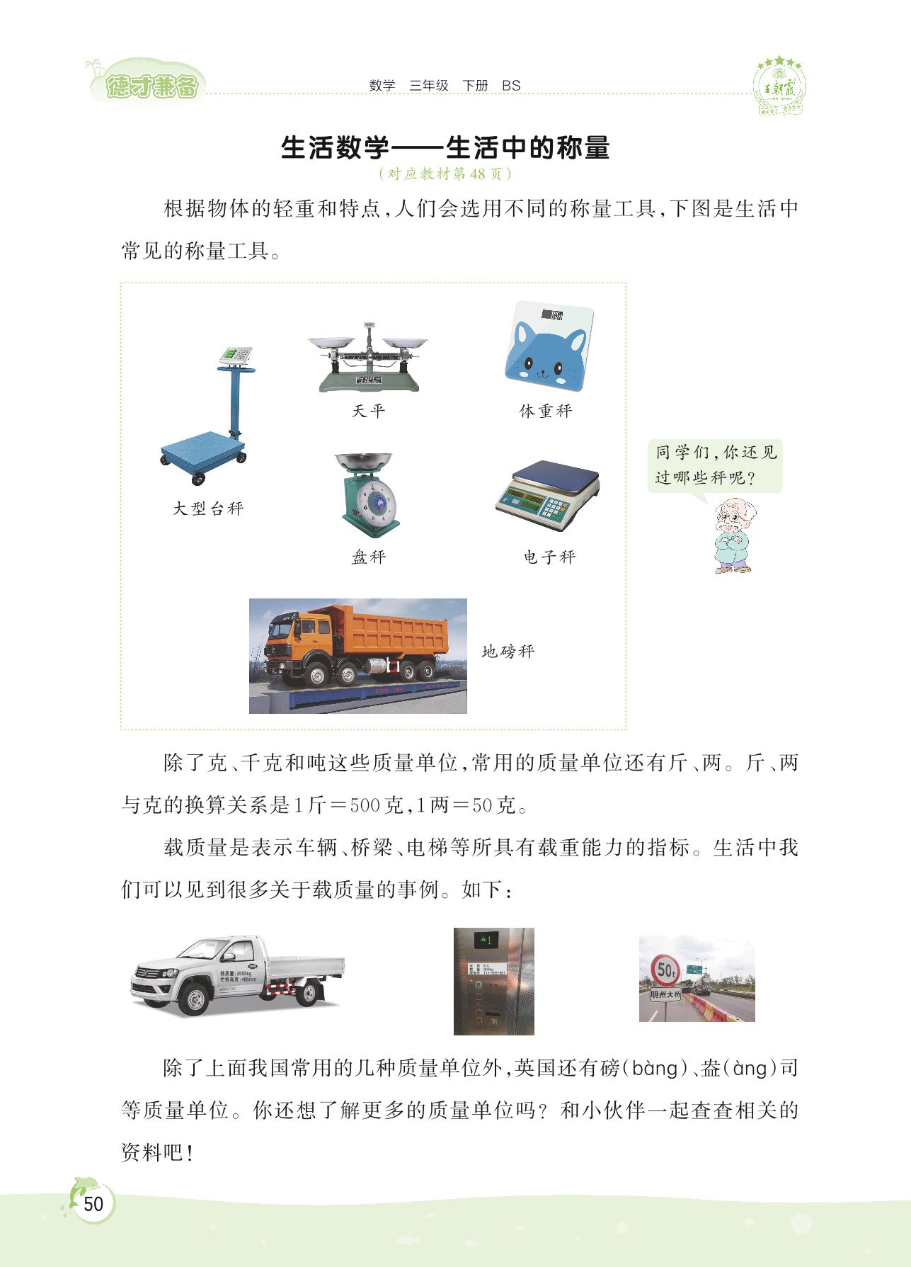 2022下册三年级数学北师版 第四单元 千克、克、吨——生活数学 生活中的称量