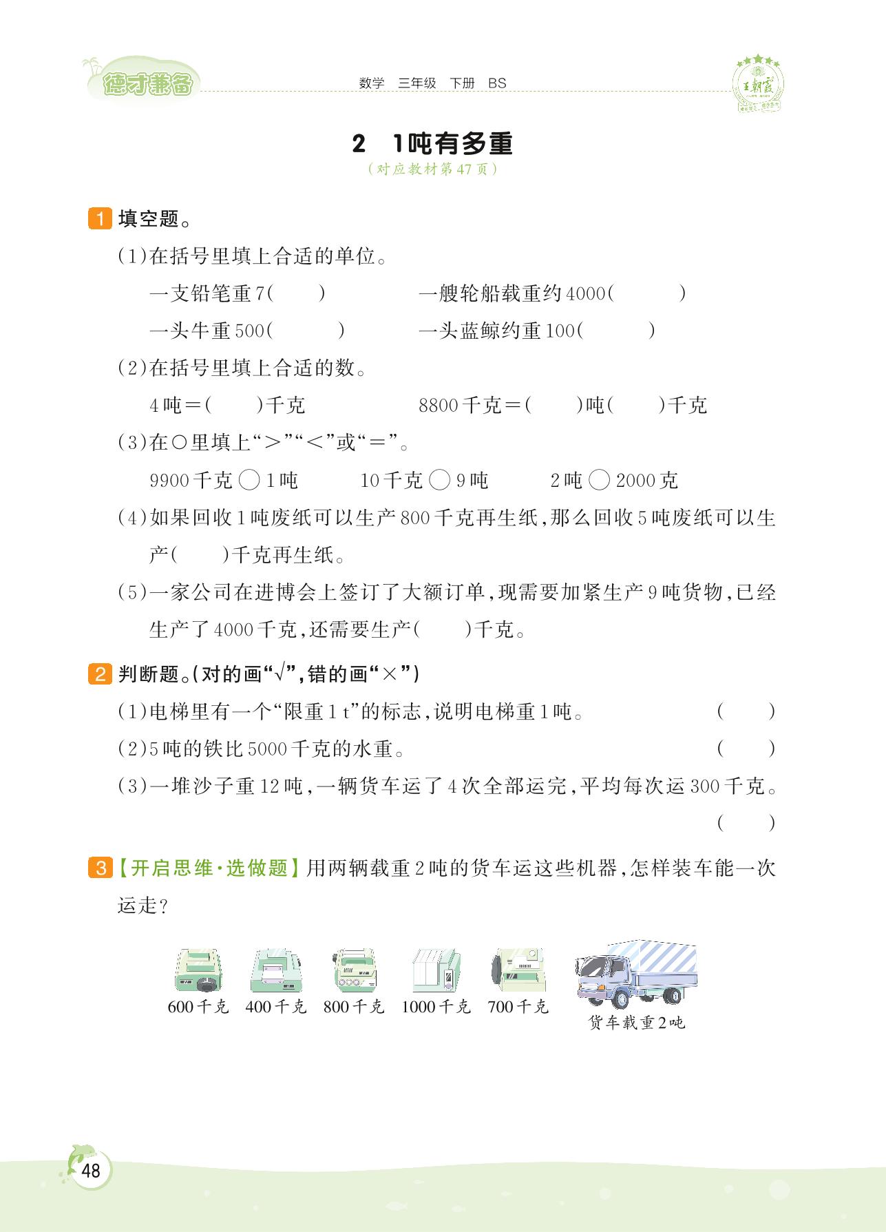 2022下册三年级数学北师版 第四单元 千克、克、吨——2 1吨有多重