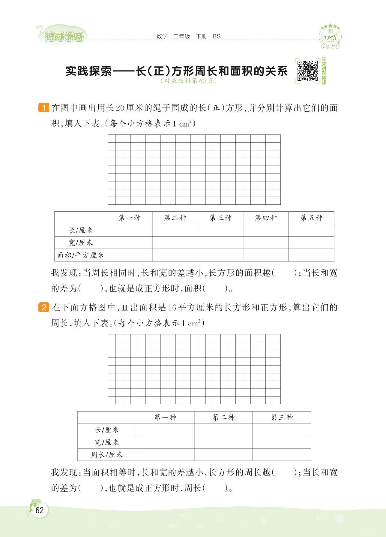 2022下册三年级数学北师版 第五单元 面积——实践探索 长(正)方形周长和面积的关系