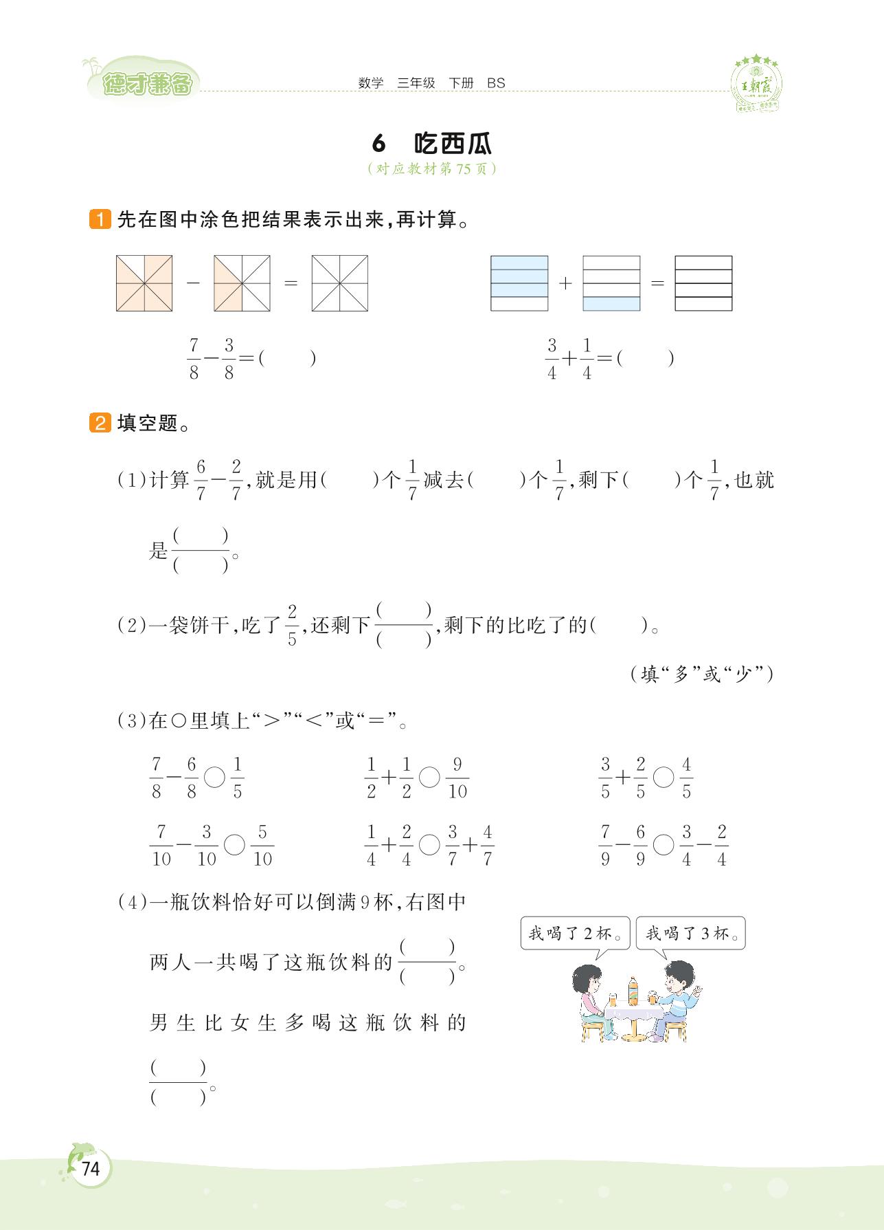 2022下册三年级数学北师版 第六单元 认识分数——6 吃西瓜