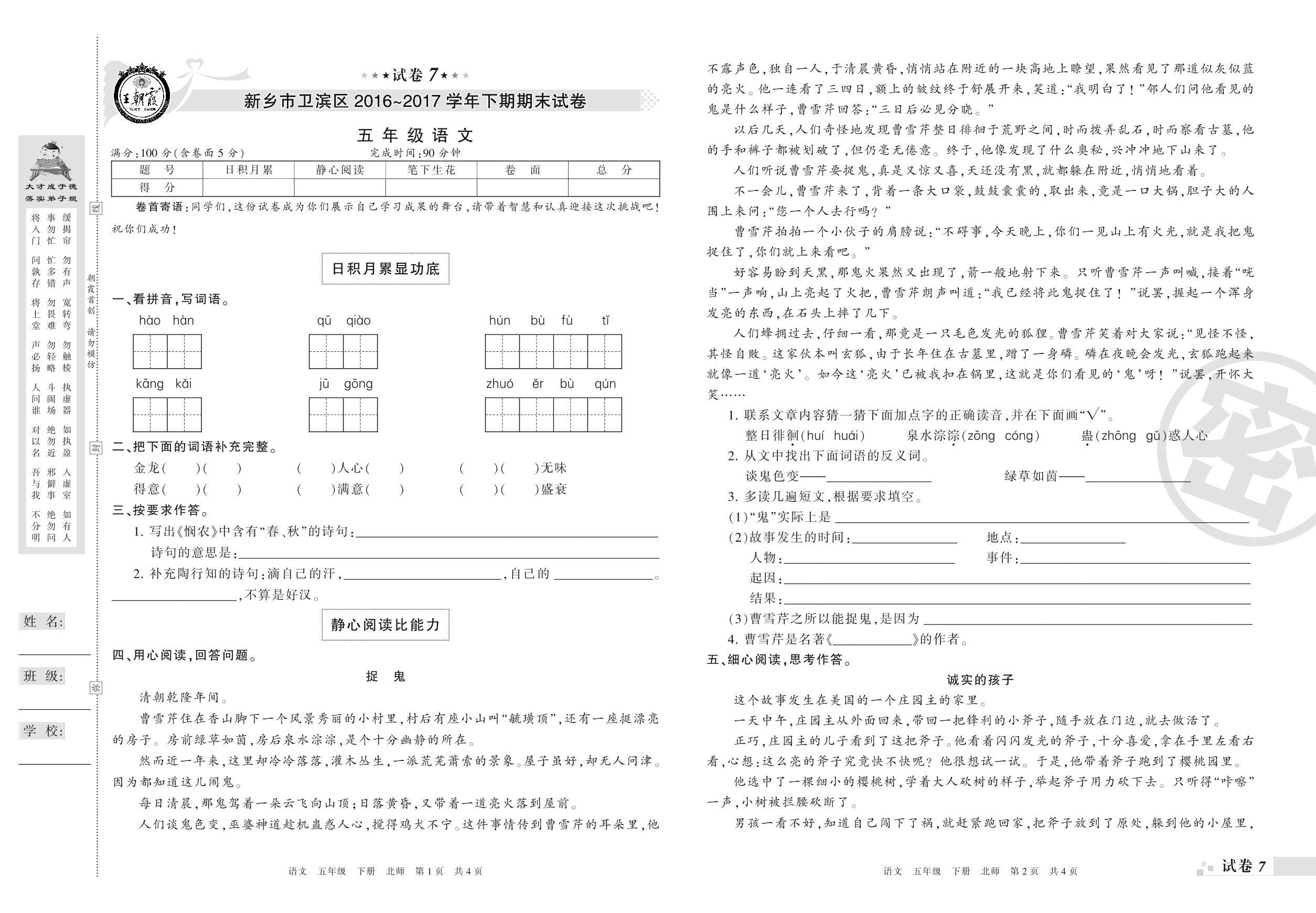 2016-2017学年第二学期新乡市卫滨区五年级语文试卷(北师版)【7】