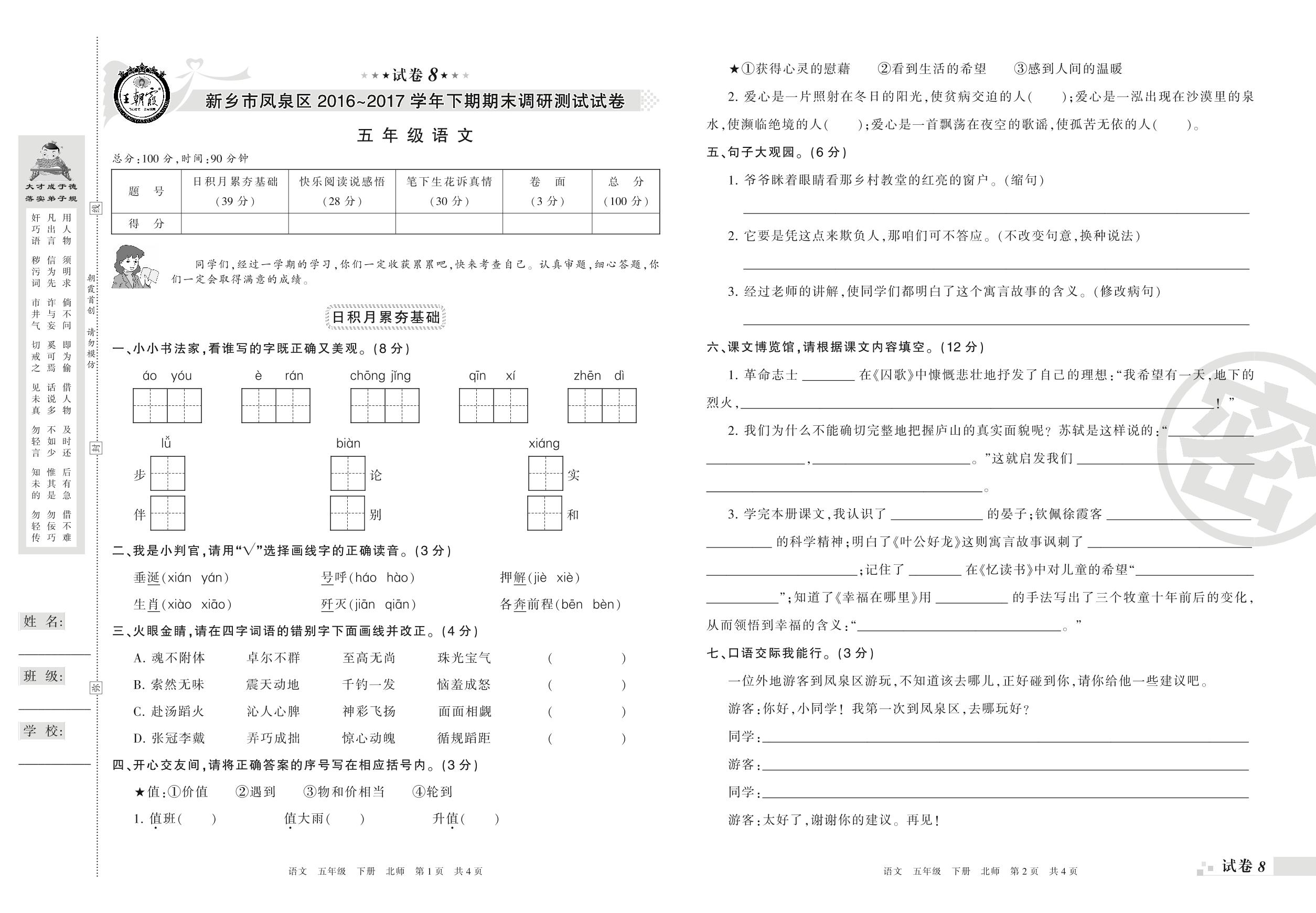 2016-2017学年第二学期新乡市凤泉区五年级语文试卷(北师版)【8】