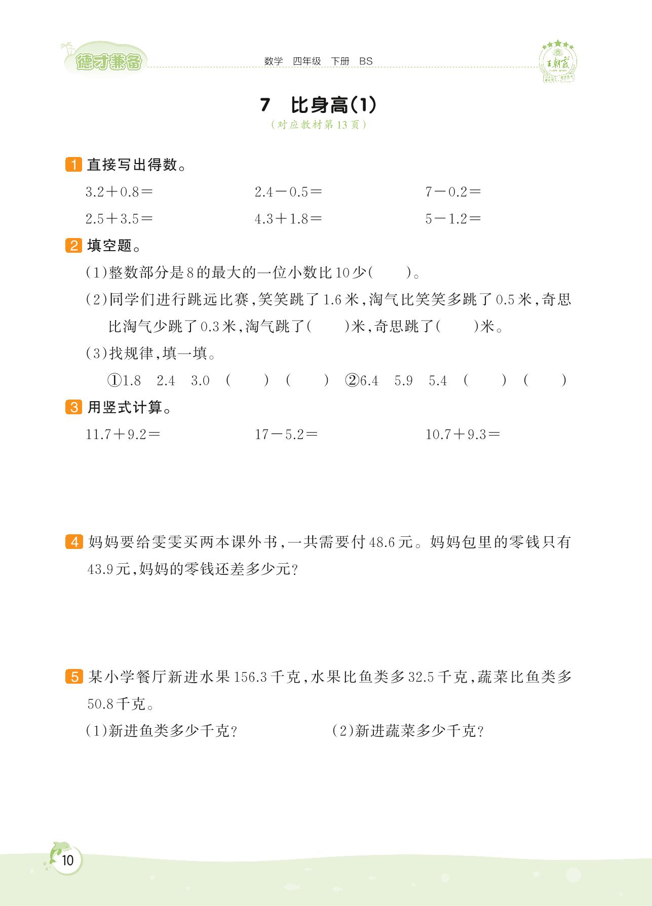 2022下册四年级数学北师版 第一单元 小数的意义和加减法——7 比身高(1)