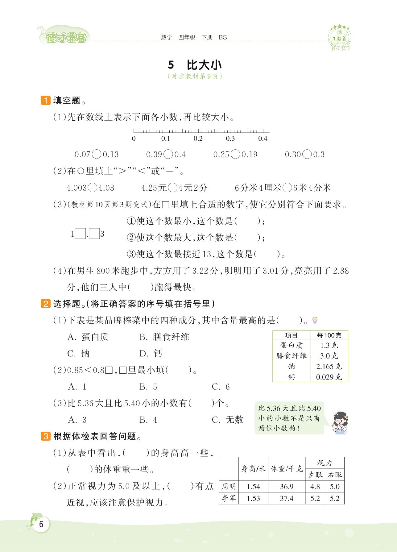 2022下册四年级数学北师版 第一单元 小数的意义和加减法——5 比大小