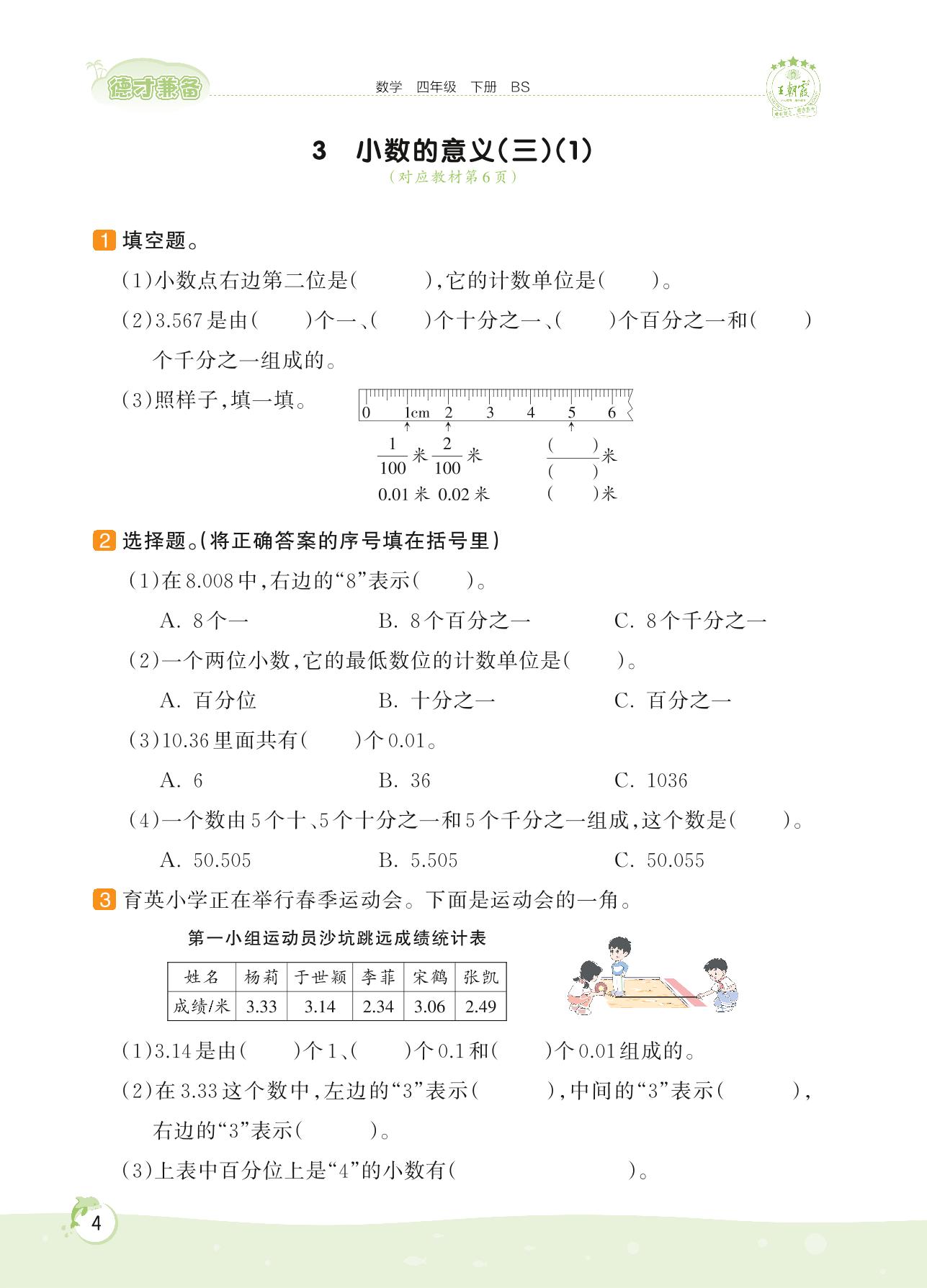 2022下册四年级数学北师版 第一单元 小数的意义和加减法——3 小数的意义(三)(1)