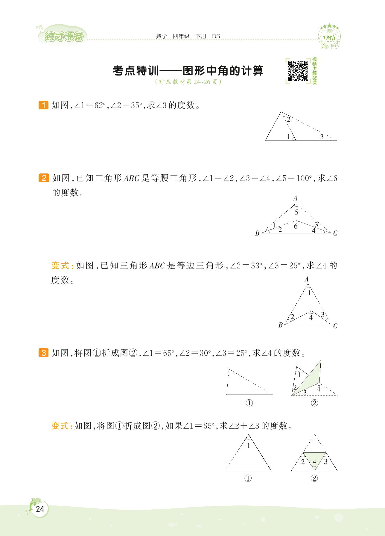 2022下册四年级数学北师版 第二单元 认识三角形和四边形——考点特训 图形中角的计算