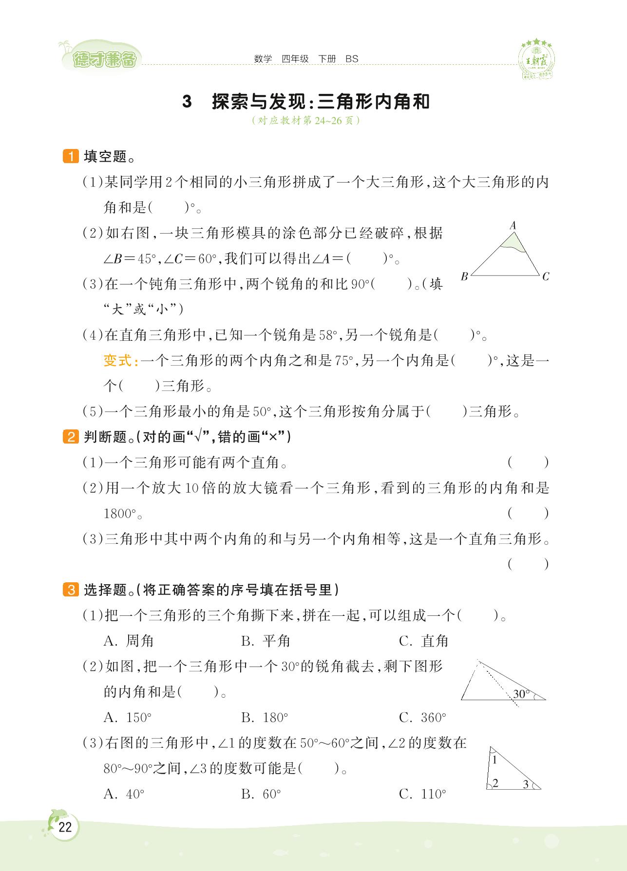 2022下册四年级数学北师版 第二单元 认识三角形和四边形——3 探索与发现:三角形内角和