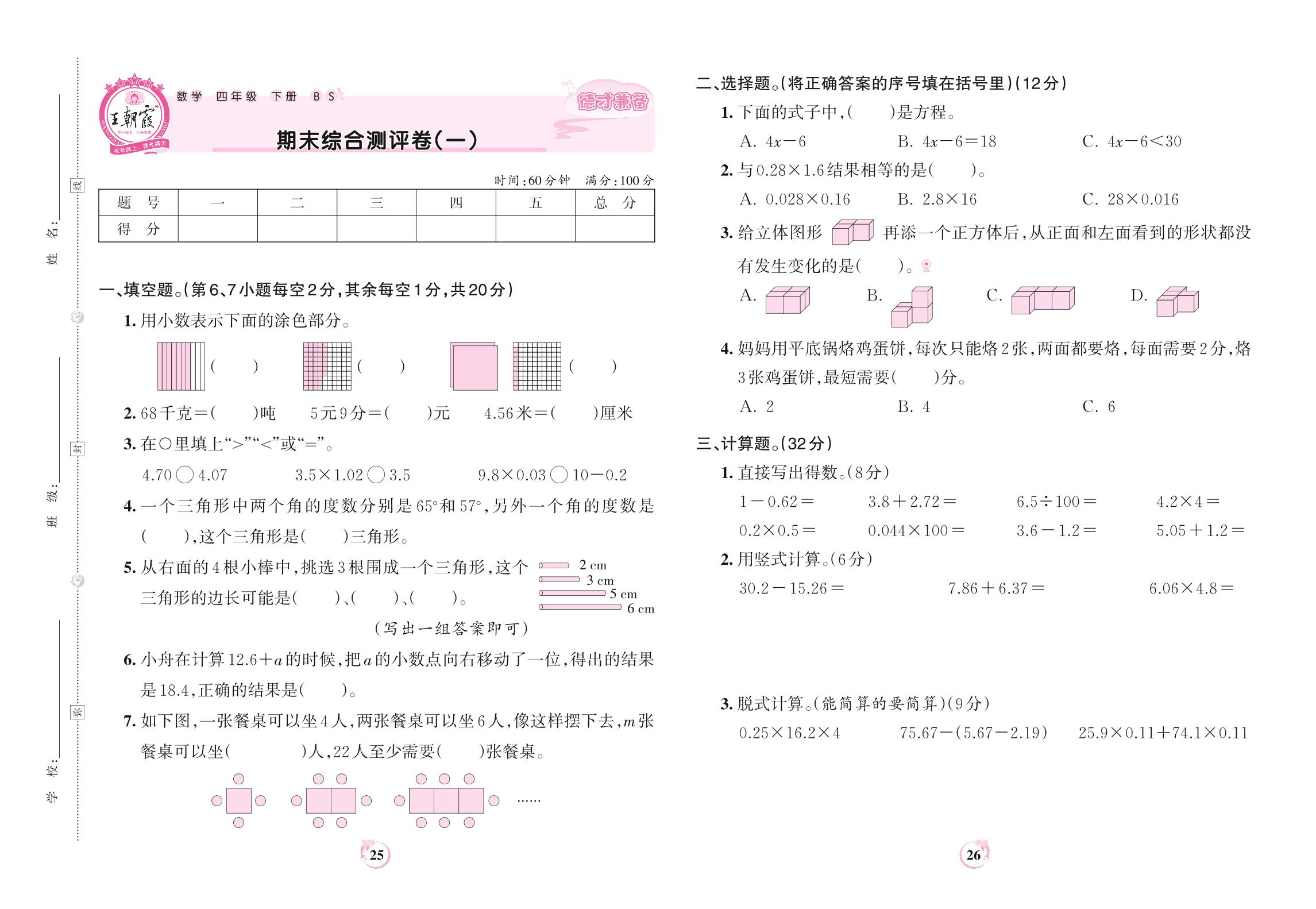2022下册四年级数学北师版 期末综合测评卷(一)